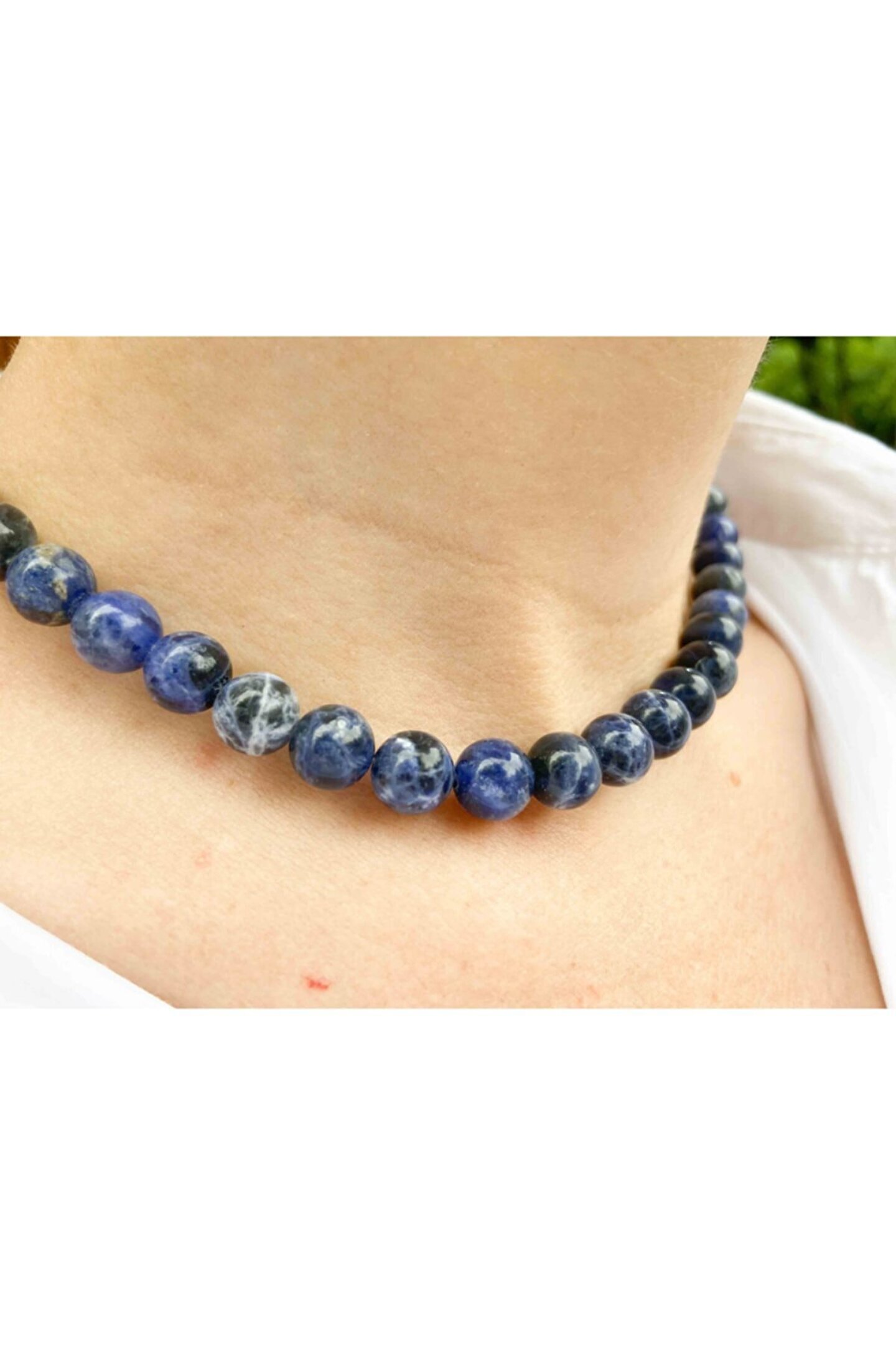 Doğal Sodalit taşı kullanılarak üretilmiş, şıklığı ve doğallığı bir arada sunan kolye; 8 mm boyutundaki zarif tasarımıyla, her türlü kıyafetle uyum sağlayacak şekilde tasarlanmıştır; Sodalit taşı, benzersiz renk tonları ve desenleriyle göz alıcı bir görünüm kazandırır; Doğal taş materyali sayesinde her kolye benzersizdir ve her kullanımda farklı bir deneyim sunar;