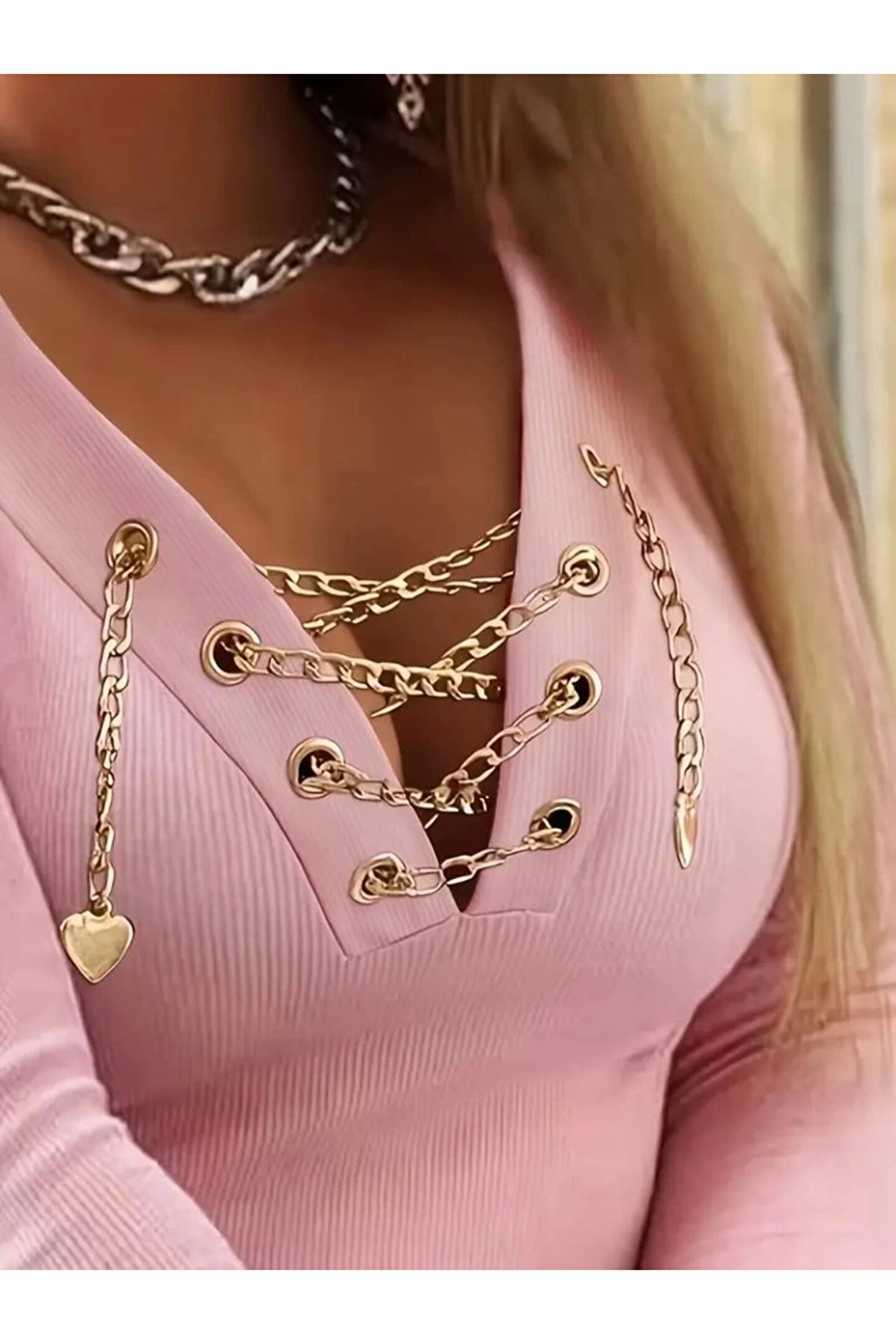 Kadın Uzun Kollu V çapraz Zincir Detaylı Kaşkorse Bluz