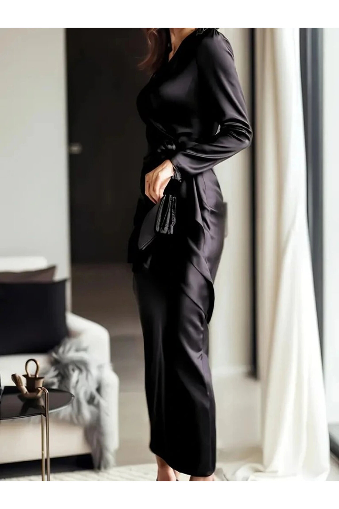 Mulvix Kadın Uzun Kollu Kruvaze Yakalı Beli Kuşaklı Uzun Saten Elbise