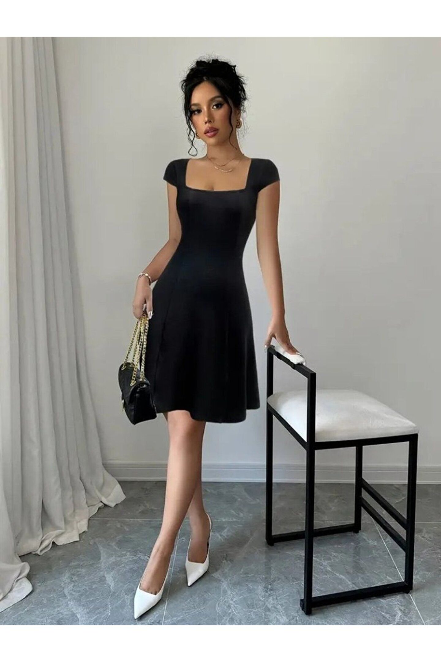 Kadın Kısa Kollu Geometrik Yakalı Janjan Krep Elbise