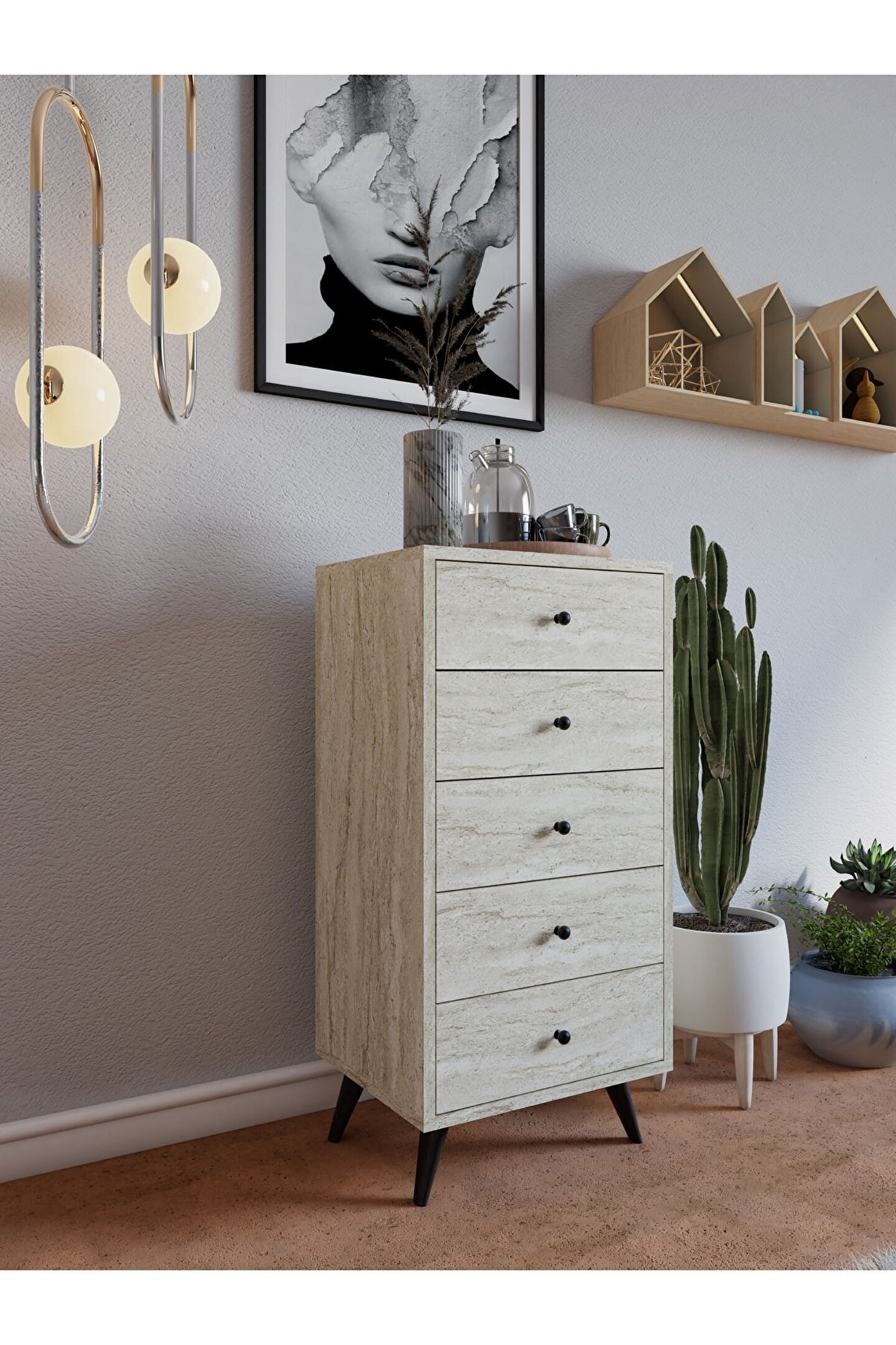 - Suntalam malzemesi sayesinde uzun ömürlü ve dayanıklı kullanım sunar; - Modern tasarımı, evinizin dekorasyonuna şık bir dokunuş katar; - Beş geniş çekmece kapasitesi, giysilerinizden aksesuarlarınıza kadar tüm eşyalarınız için bolca saklama alanı sunar; - Modern stil sahibi olan bu şifonyer, yaşam alanlarınıza çağdaş bir hava katmak için idealdir;