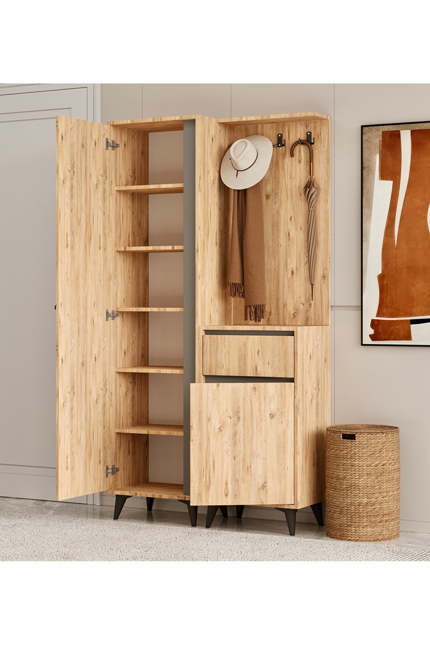 MYMOB USE PORTMANTO - Modern tasarımı ile evinizin dekorasyonuna şık bir dokunuş ekler.; - 1 yıl garanti süresiyle güvenilir kullanım sunar.; - 100 cm genişliği ve 35 cm derinliği, geniş depolama alanı sağlar ve düzenli bir görünüm kazandırır.; - Suntalam materyali sayesinde dayanıklılık ve uzun ömürlü kullanım vaat eder.; - 190 cm yüksekliği ile hem estetik hem de fonksiyonel bir yapıya sahiptir.; - Türkiye menşeli olmasıyla yerel üretimden yana tercih yapmanızı sağlar.;