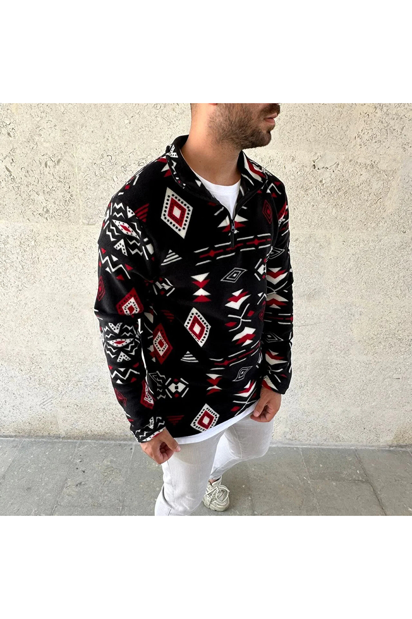 mzpkartan Erkek Yarım Fermuarlı Desenli Polar Sweat Tribal Etnik Desen Yakalı, Uzun Kollu, Oversize Rahat Kalı