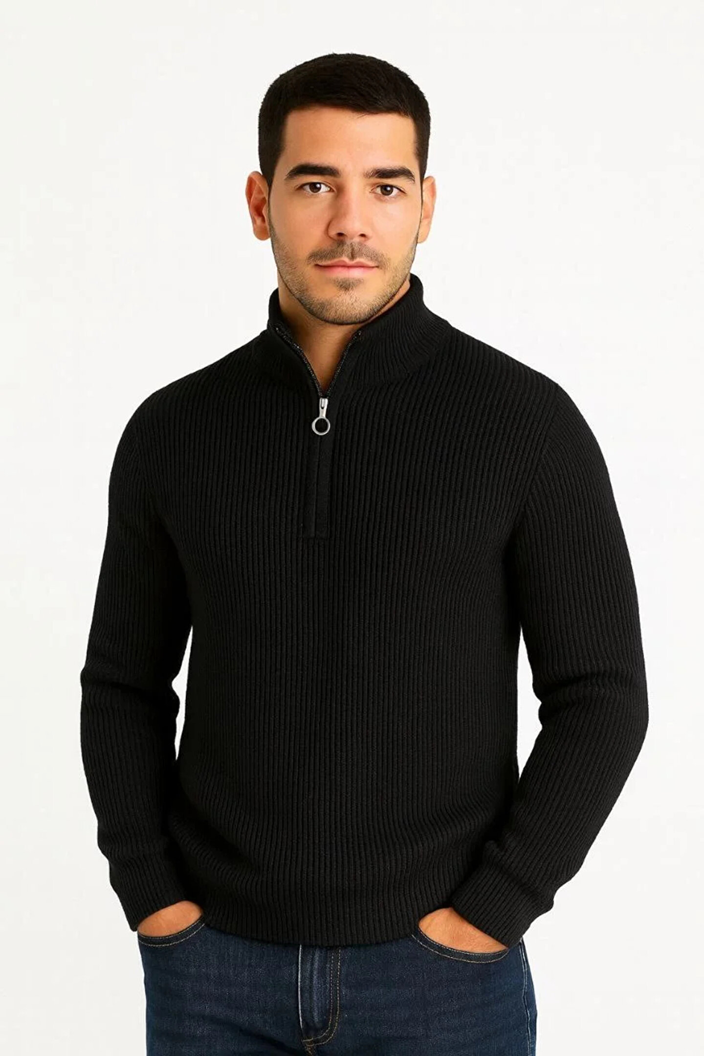 Erkek Yarım Fermuarlı Triko Kazak – Selanik Örgü, Dik Yaka, Pamuklu Dokuma, Regular Fit Uzun Kollu Kışlık Model - Siyah