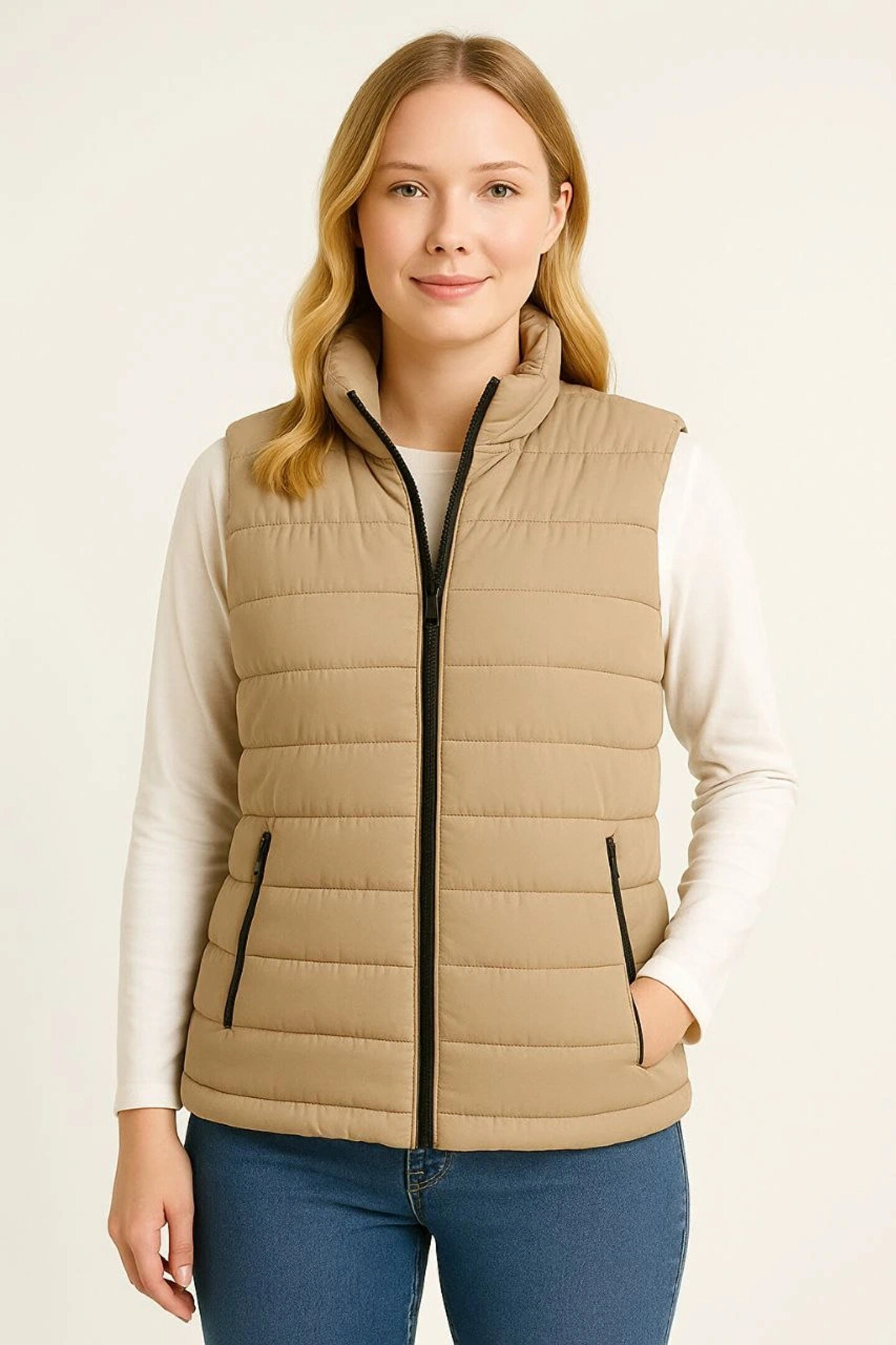 mzpkartan Kadın Şişme Fermuarlı Yelek Su itici Kapitone Astarlı Kumaş Cepli Hafif Kışlık Spor Rahat Kalıp - Be