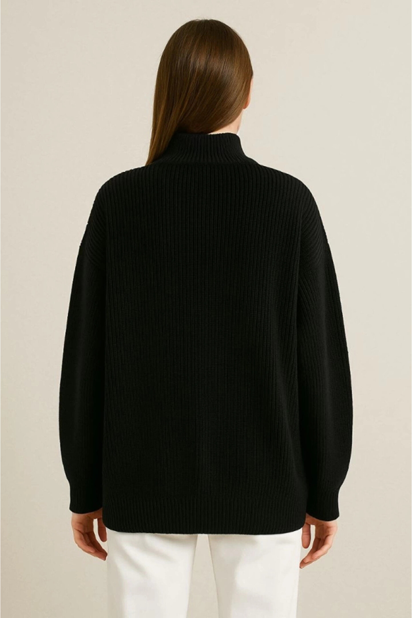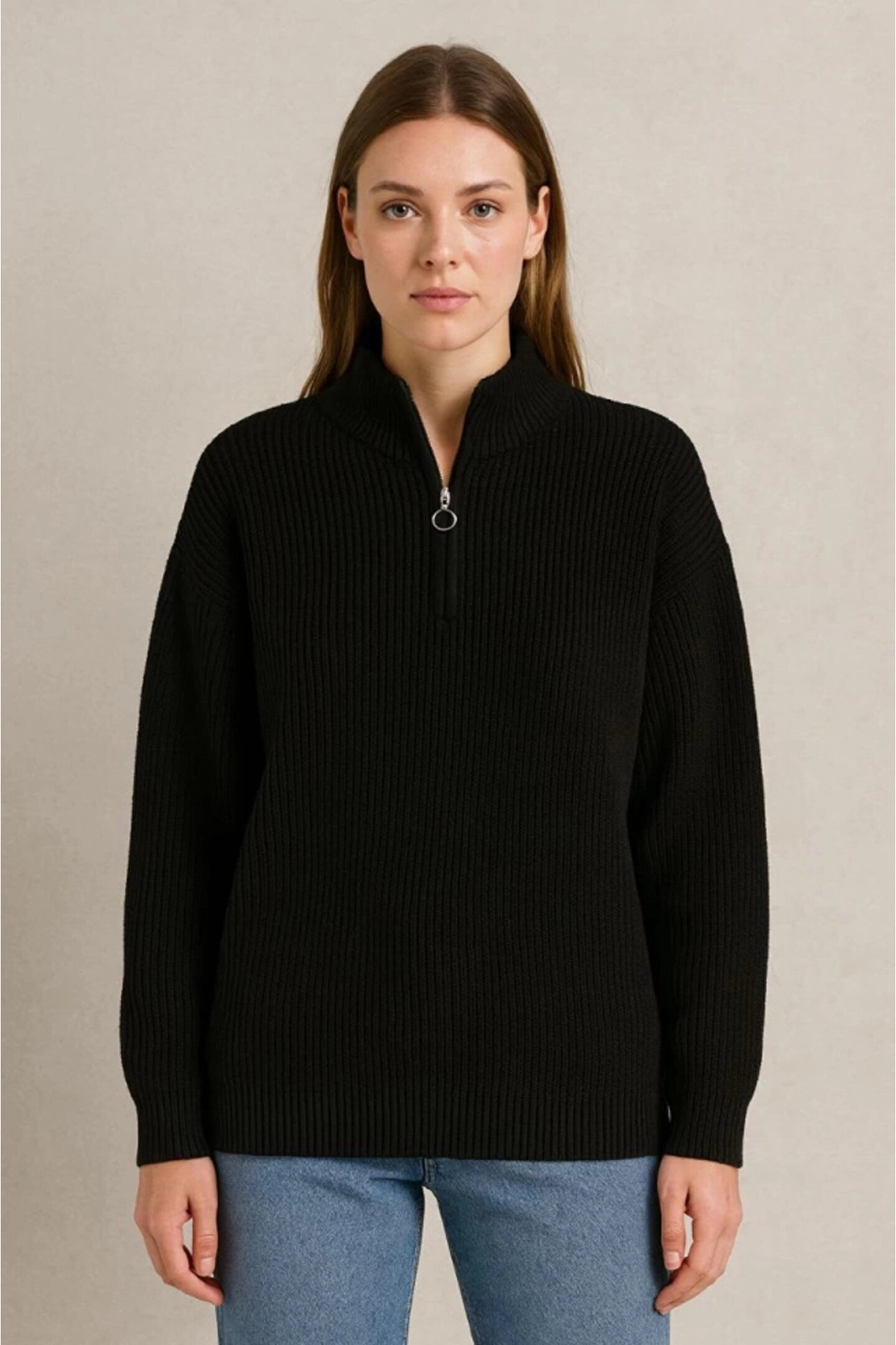 KADIN Yarım Fermuarlı Triko Kazak – Selanik Örgü, Dik Yaka, Pamuklu Dokuma, Oversize Uzun Kollu Kışlık Model - Siyah