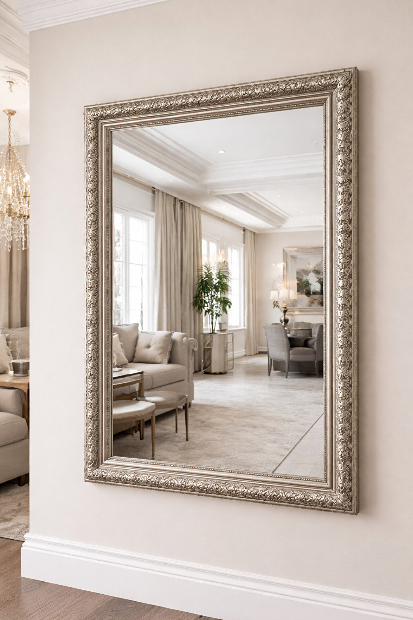 Narkissos Dizayn Gümüş Çerçeveli Ayna-5cm Çerçeve Genişliği-Gümüş Ayna-Klasik Ayna-Varaklı Ayna - Salon Ayna