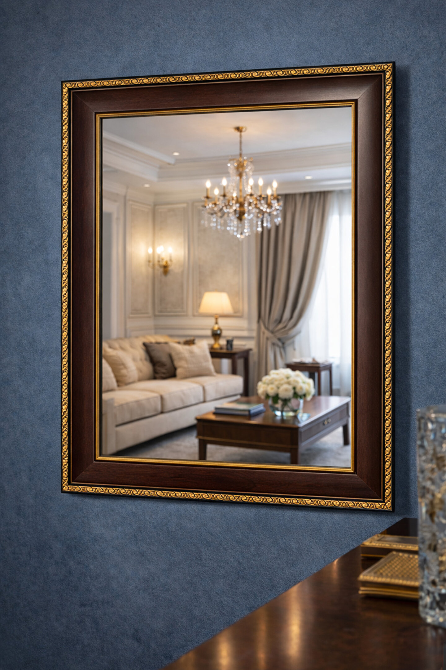 Narkissos Dizayn Kahverengi Ahşap Görünümlü Gold Altın Detaylı Çerçeveli Ayna 5cm Genişlikte Çerçeve-Klasik Lüx Ayna