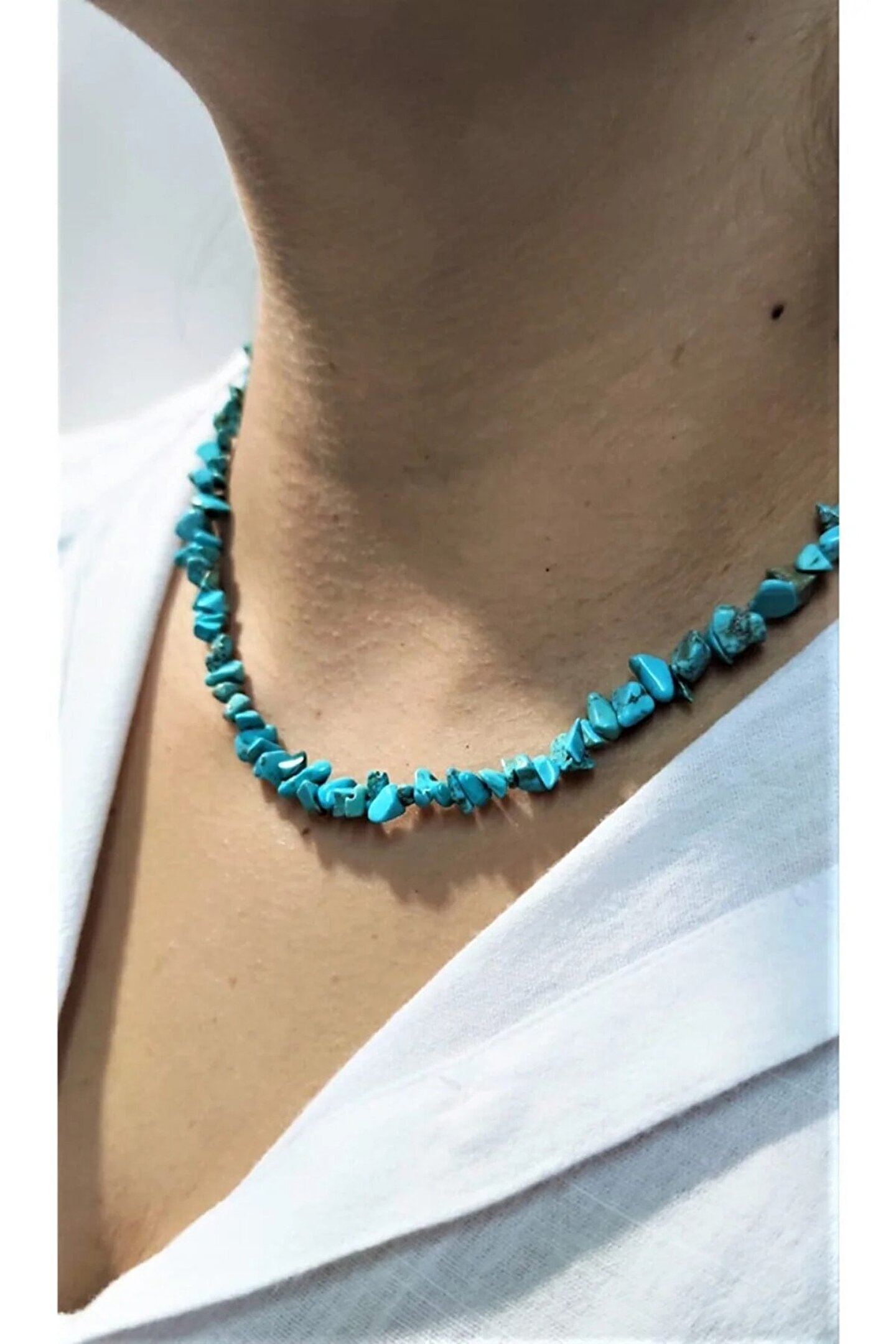 Doğal taş kullanımı sayesinde her kolye benzersiz ve otantik bir görünüm sunar; Turkuaz firuze ve kırıktaş gibi değerli taşlarla tasarlanmıştır, bu da kolyenin hem şık hem de göz alıcı olmasını sağlar; El işçiliği ile üretilmiş olup, her bir detayı özenle işlenmiştir ve bu da kolyenin kalitesini ve estetiğini artırır; Doğal taşların renk ve desen farklılıkları, her bir kolyenin eşsiz ve kişisel bir dokunuş kazanmasını sağlar;