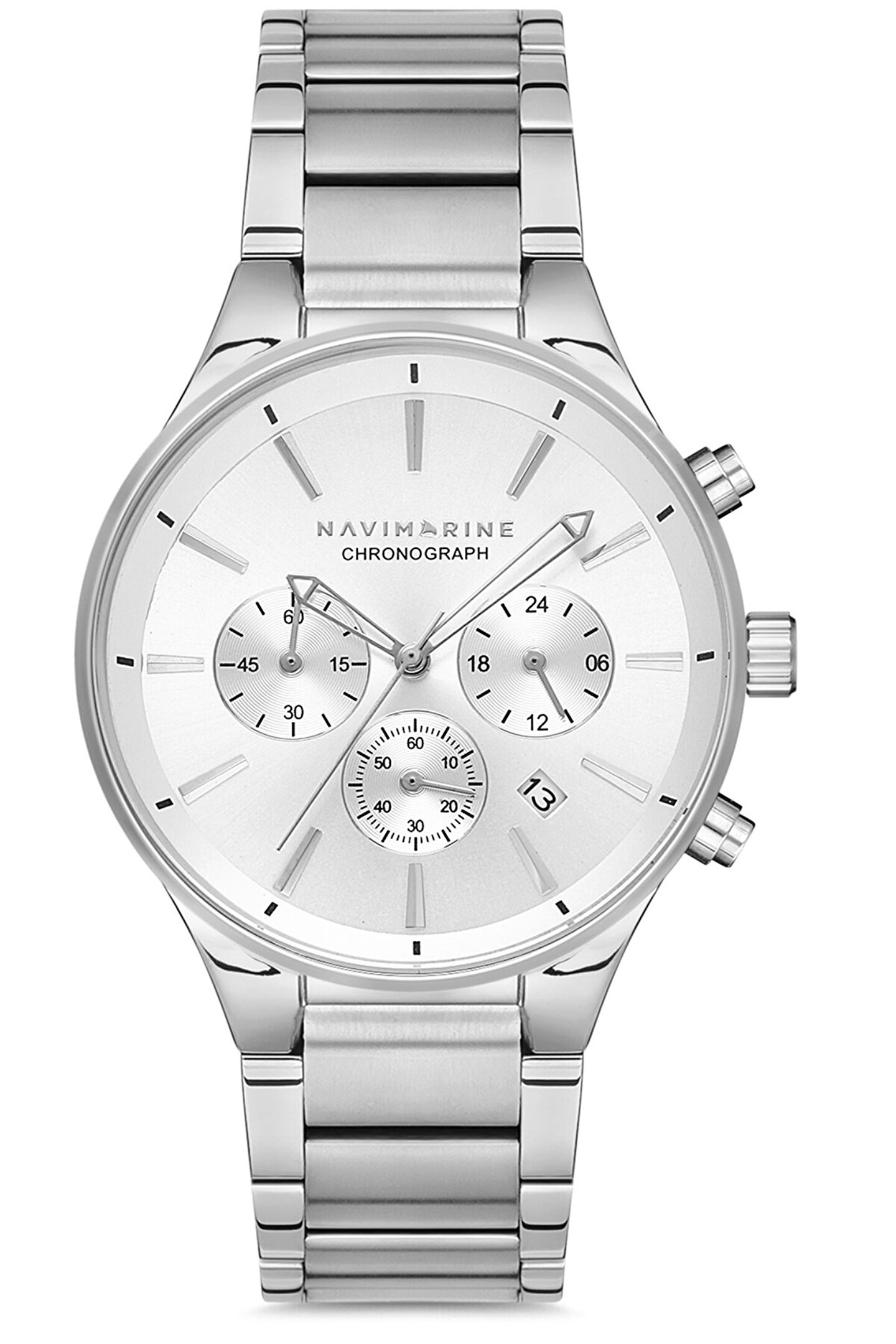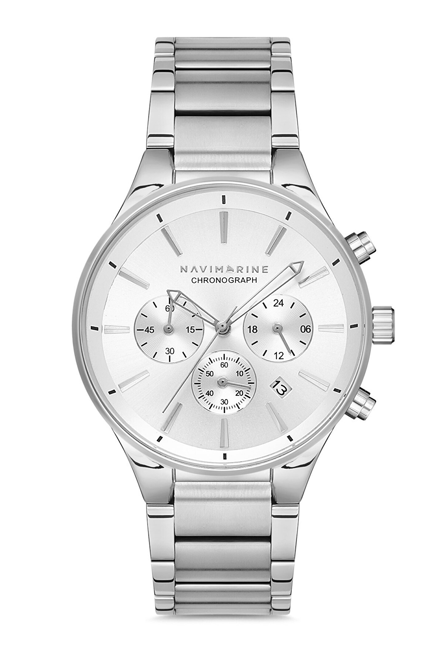 Markası:Navimarine Cinsiyet: Erkek Kadran rengi: Beyaz Kasa: Metal Kasa Rengi:Metalik Kasa Şekli: Yuvarlak Kordon Cinsi: Çelik Kordon Rengi:Metalik Cam:Minarel Garanti: 2Yıl Makine: Pilli Takvim: Var Kronometre Var Ebatı: Dıştan 42mm Kadran ebatı:40mm Su geçirmezlik:3atm