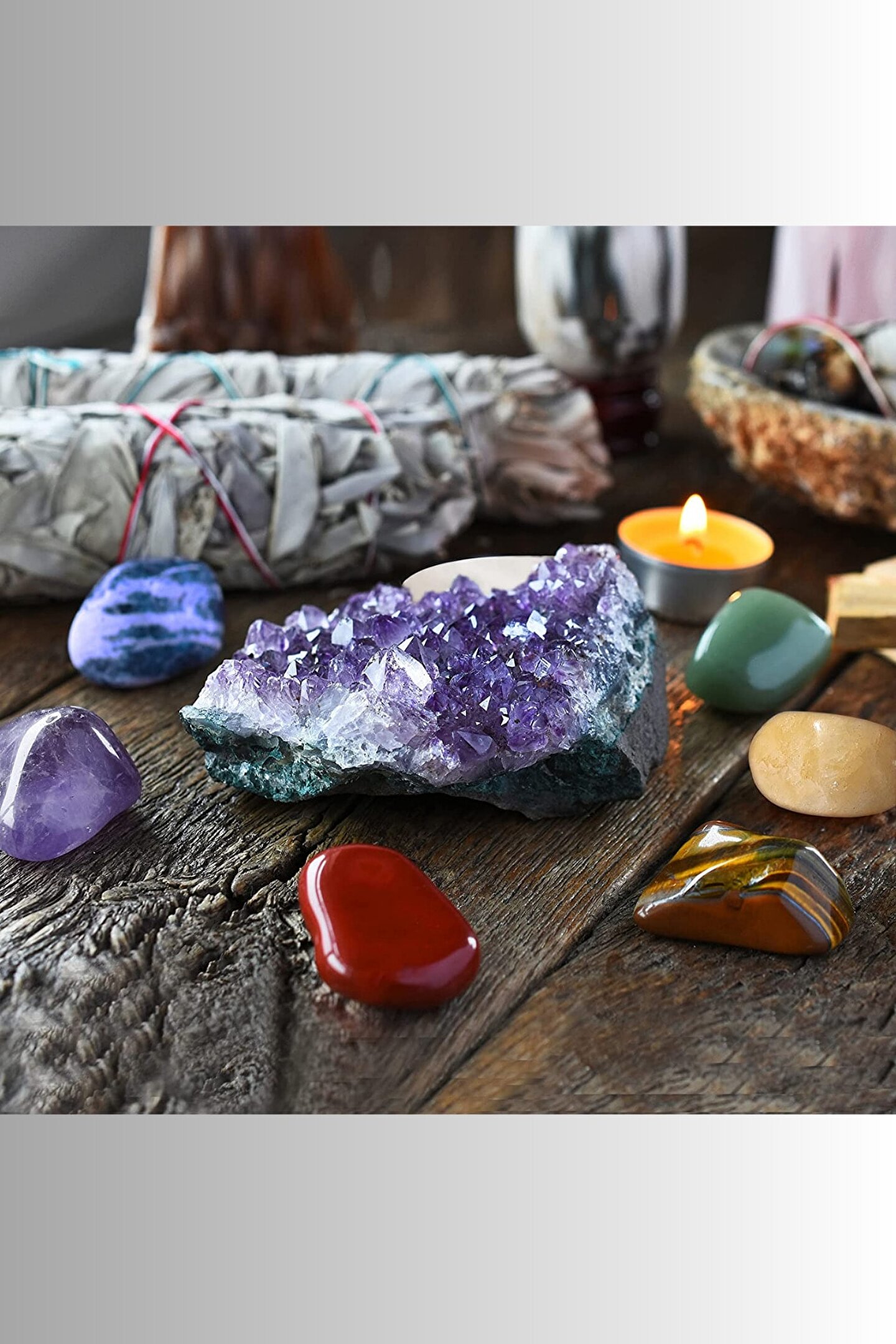 - Doğal taşların şifa gücünü evinize taşıyan bu set, pozitif bir ortam yaratmanıza yardımcı olur; - Ametist taşı, 7 çakra tımbıl taşı olarak bilinir ve her biri farklı bir enerji merkezi temsil eder; - Metal materyal kullanımı sayesinde dayanıklılık ve uzun ömürlü kullanım sunar; - Dekoratif objelerinizle uyumlu, doğal taşların estetik dokunuşunu yaşam alanlarınıza getirir;