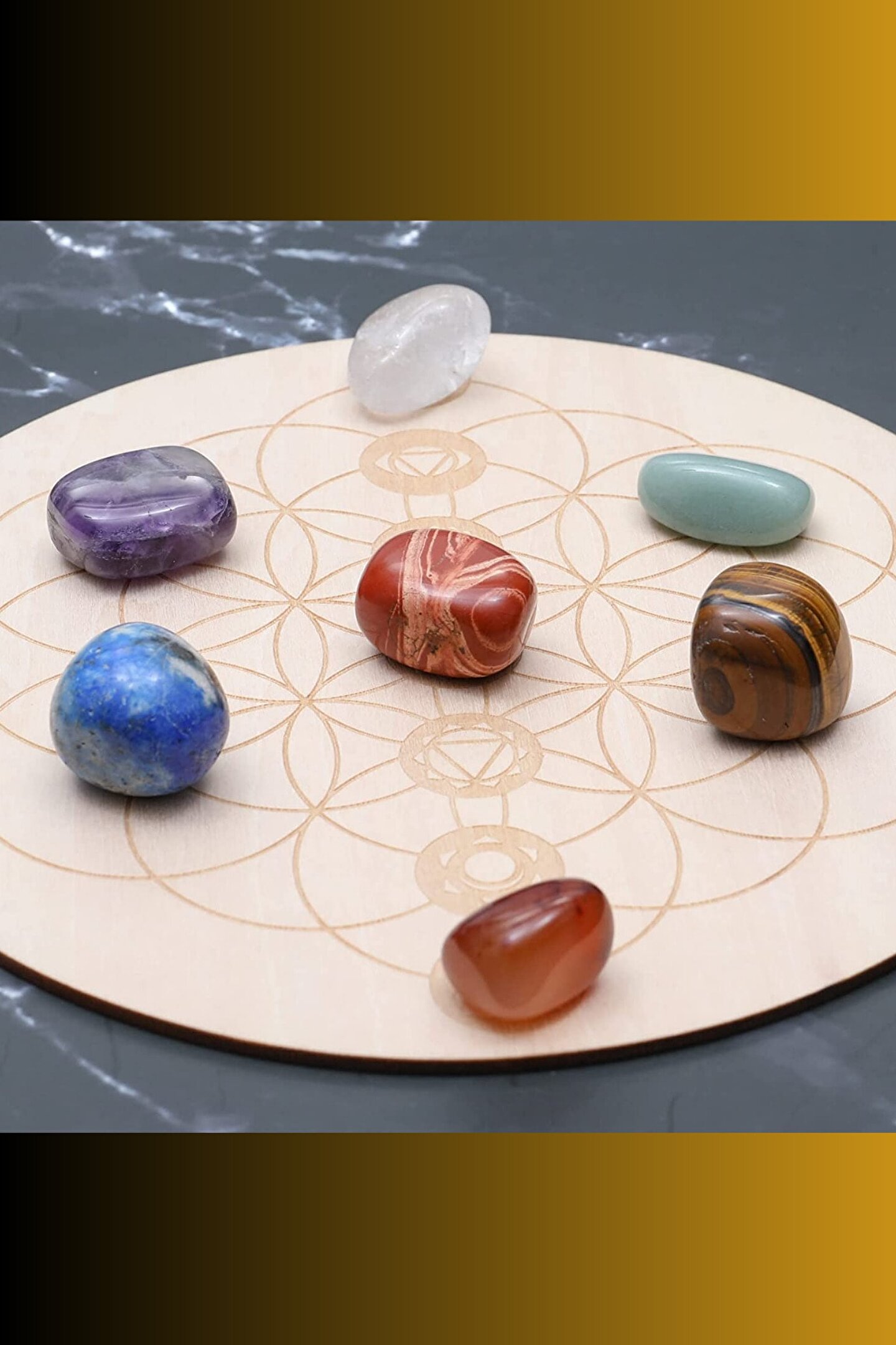 Doğal taşların şifa gücünü evinize taşıyan bu set, beton malzemesiyle dayanıklılığı ve estetiği bir arada sunar; Korkaklık, nazara ve uykusuzluk gibi sorunlara karşı etkili olduğu bilinen 7 çakra taşı ile kişisel şifanızı artırın; Doğal taşların benzersiz desenleri ve renkleriyle dekoratif bir dokunuş yaparak mekanınıza doğanın huzurunu getirin;