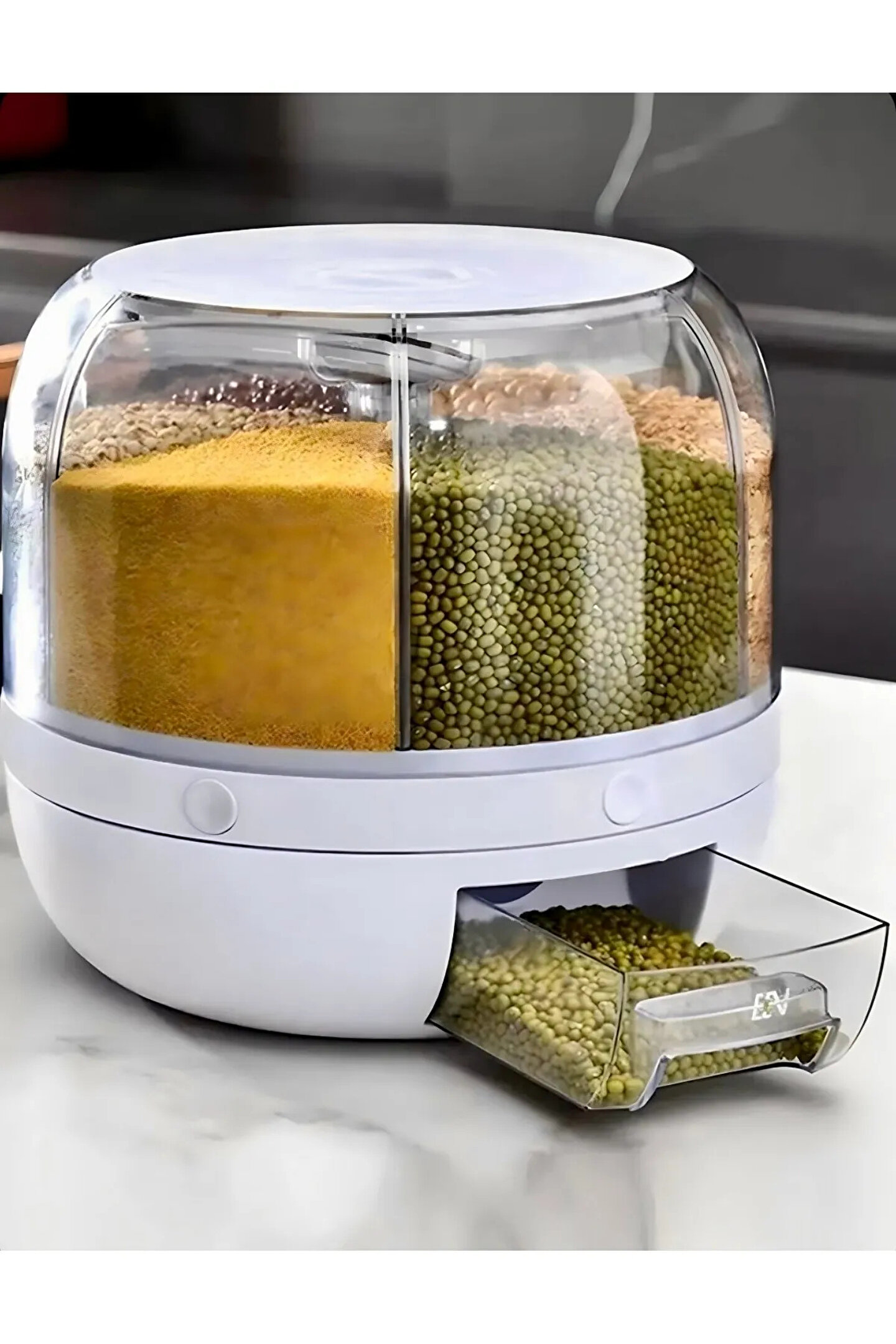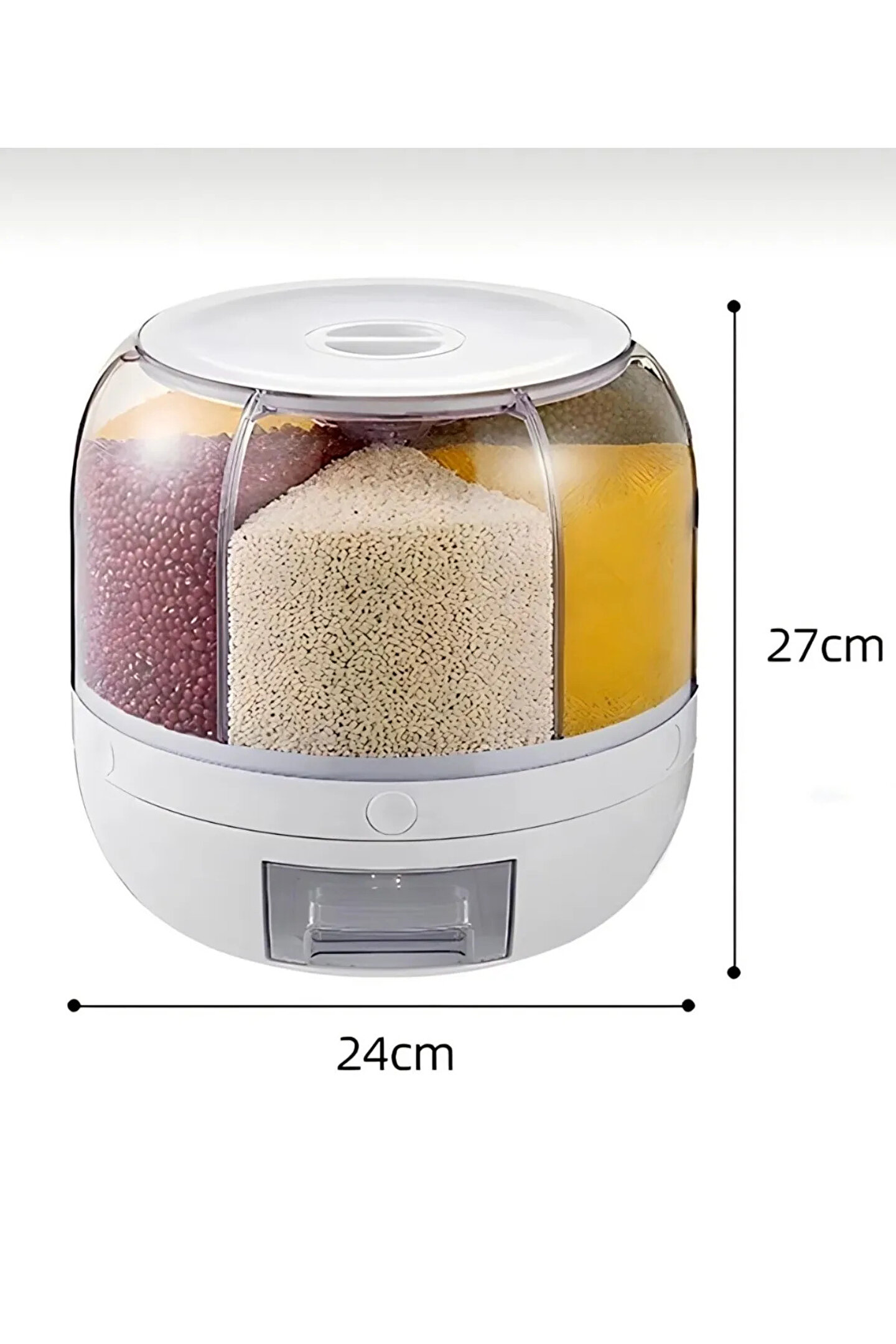Kuru Gıda Ve Bakliyat Organizeri 360° Dönebilen 6 Bölmeli Hava Geçirmez Saklama Kabı 6 Lt Kuru Gıda Ve Bakliyat Organizeri 360° Dönebilen 6 Bölmeli Ayrıştırıcılı Hava Geçirmez Saklama Kabı Hava geçirmez kuru depolama sistemi ile silikon mühürlü kolay kilitli kapak.; ; Dayanıklı ve kolay istiflenebilir, çok yer kaplamaz.; ; Bulaşık makinesinde yıkanabilir.; ; 360 Derece Dönüş Ergonomik Tasarım Pratik Kullanım Çıkarılabilir Üst Kapak Tek Tuş Kullanım 24x27 Boyutlara Sahiptir Toplamda 6 Bölmeye Ve Her Bölme 1 LT Kapasiteye Sahiptir.; ; Düğmeler Hazneyle Eşit Hizalandıktan Sonra Kullanılmalıdır.
