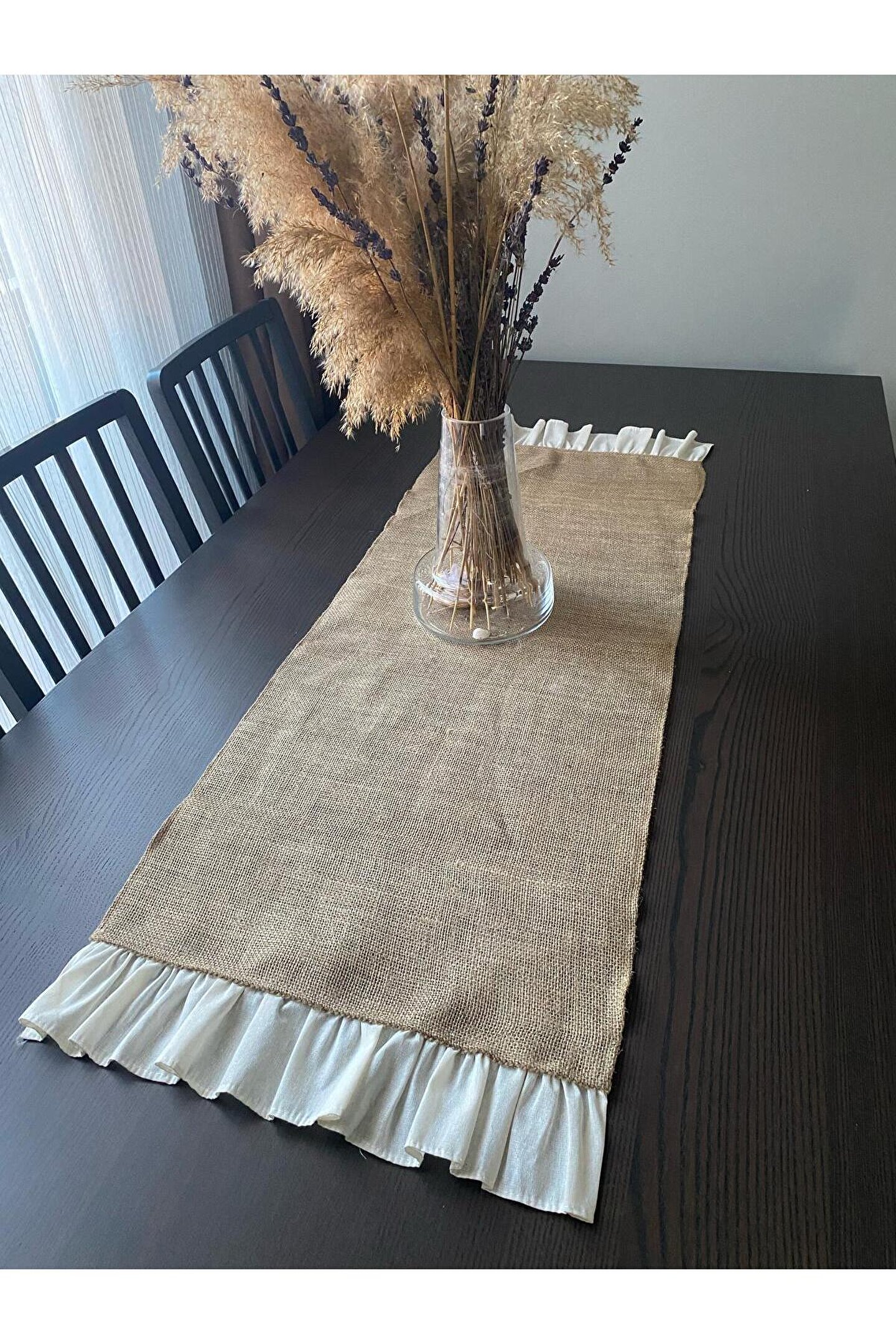 - Doğal jüt malzemesinden üretilmiş, dayanıklı ve uzun ömürlü kullanım sunar.; - 40x120 cm boyutlarındaki dikdörtgen tasarımı ile mekanınıza şık bir görünüm katar.; - Tek parça halinde gelen bu runner, kolayca yerleştirilebilir ve pratik bir dekorasyon seçeneği sağlar.; - Fırfırlı detayları ile modern ve estetik bir dokunuş eklerken, oturma alanlarınıza sıcaklık katmayı başarır.; Ürün tek parça 40x120 olan runner olarak gönderilmektedir.; Görseldeki diğer ürünler dekor amaçlıdır.;