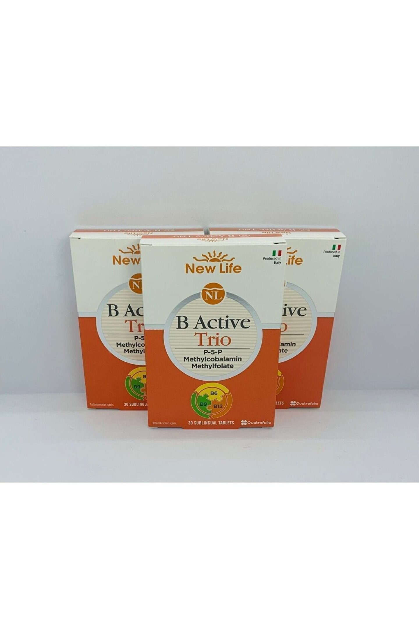 New Life B Active Trio 30 Dilaltı Tablet 3 Adet İçindekiler : Stabilizörier: Mannitol, polivinilpolipirolidon, ksilitol, emülgatör, mikrokristalin selüloz, piridoksal 5-fosfat (B6 vitamini), asitlik düzenleyici: kalsiyum fosfat, emülgatör, yağ asitlerinin mono- ve digliseritleri, aroma vericiler: vanilya aroması, vişne aroması, emülgat?r: yağ asitlerinin magnezyum tuzları, topaklanmayı önleyici: silikon dioksit, metilkobalamin (B12 vitamini), (6S)-5-metiltetrahidrofolik asit, glukozamin tuzu (folik asit) (Quatrefolic), tatlandırıcılar, sukraloz, steviol glikozitler, neohesperidin DC. ; Quatrefolic ((6S)-5-metiltetrahidrofolik asit, glukozamin tuzu) Gnosis S.p.A. ; Corporalion'ın tescilli markasıdır. ; Tavsiye Edilen Günlük Alım Dozu : Yetişkinler için tavsiye edilen günlük tüketim miktan 1 tablettir. ; Tabletleri yutmayınız. ; Dilaltında çözünmesini bekleyiniz. ; Uyarılar : Tavsiye edilen günlük porsiyonu aşmayınız. ; Takviye edici gıdalar normal beslenmenin yerine geçemez. ; Çocukların ulaşamayacağı yerde saklayınız. ; İlaç değildir. ; Hastalıkların önlenmesi veya tedavi edilmesi amacıyla kullanılmaz. ; Hamilelik ve emzirme dönemi ile hastalık veya ilaç kullanılması durumlarında doktorunuza danışınız. ; Aşın tüketimi laksatif etki yaratabilir. ; Gluten ve laktoz içermez. ; Vegan kullanıma uygundur. ; Menşel : Italya Gidanın Net Miktarı: 7,5 g (30 tablet);