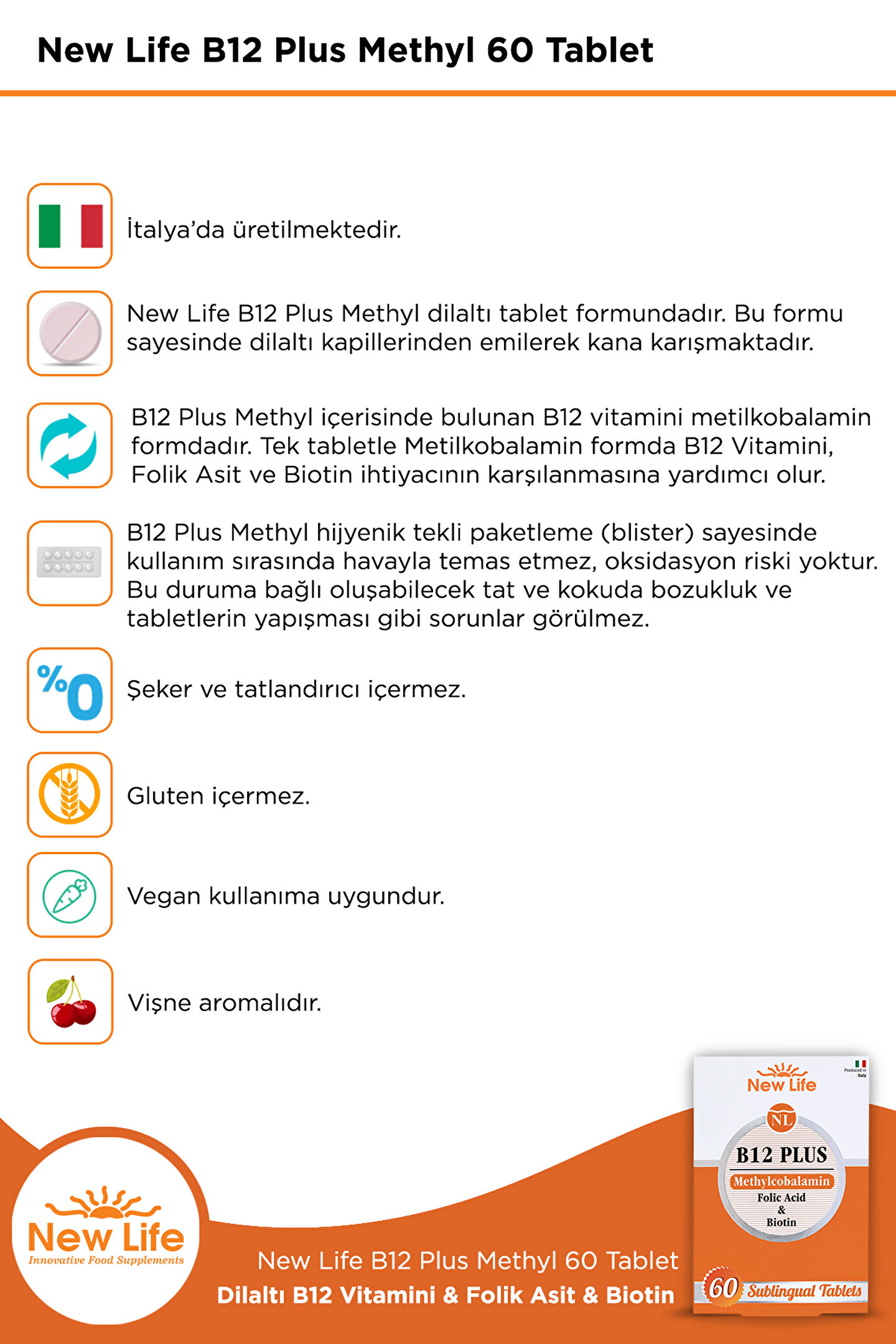 B12 plus tek tablette 1000mcg Metilkobalamin Form B12 Vitamini, 400mcg Biotin, 400mcg Folik Asit içermektedir.;New Life B12 Plus Methyl dil altı tablet formundadır. ;Şeker ve tatlandırıcı içermez. ;Hijyenik blister ambalajlıdır. ;Glüten içermez.