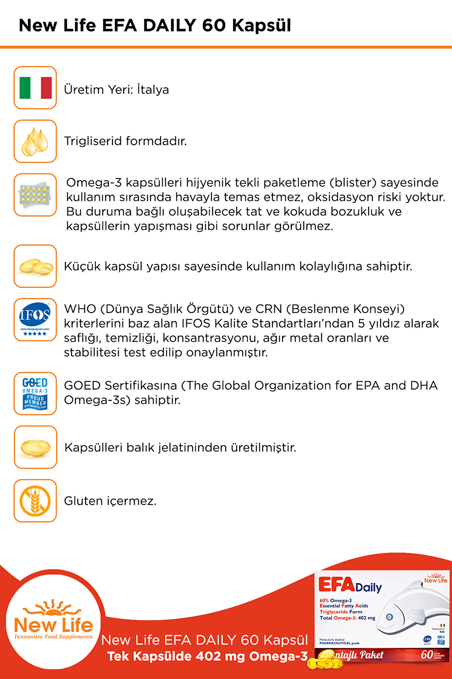 EPA/DHA kalp ve damar sağlığının korunmasına yardımcı olur.; DHA beynin normal gelişimi ile göz ve sinir sisteminin gelişimine yardımcı olur.; Kan sulandırıcı ilaç kullanan kişilerin ve hamilelerin Omega-3 kullanmadan önce doktora başvurmaları önerilir.; Omega-3 ilaç değildir, besin takviyesidir.; özelliği yoktur.; WHO (Dünya Sağlık Örgütü) ve CRN (Beslenme Konseyi) kriterlerini baz alan IFOS Kalite Standartları’ndan 5 yıldız alarak saflığı, temizliği, konsantrasyonu , ağır metal oranları ve stabilitesi test edilip onaylanmıştır.; İstanbul Üniversitesi Su Ürünleri Fakültesi tarafından analiz raporu alınarak Omega 3 içeriği onayı alınmıştır.; Şişe şeklinde ambalajlarda bulunan kontaminasyon riskini, blister ambalajıyla sıfıra indirerek ilaç kalitesinde sunulur.; Kapsülleri balık jelatininden üretilmiştir.; Küçük balıkların presslenmesi ile elde edildiği için balık kaynaklı A ve D vitamini içermez.; Gluten İçermez.