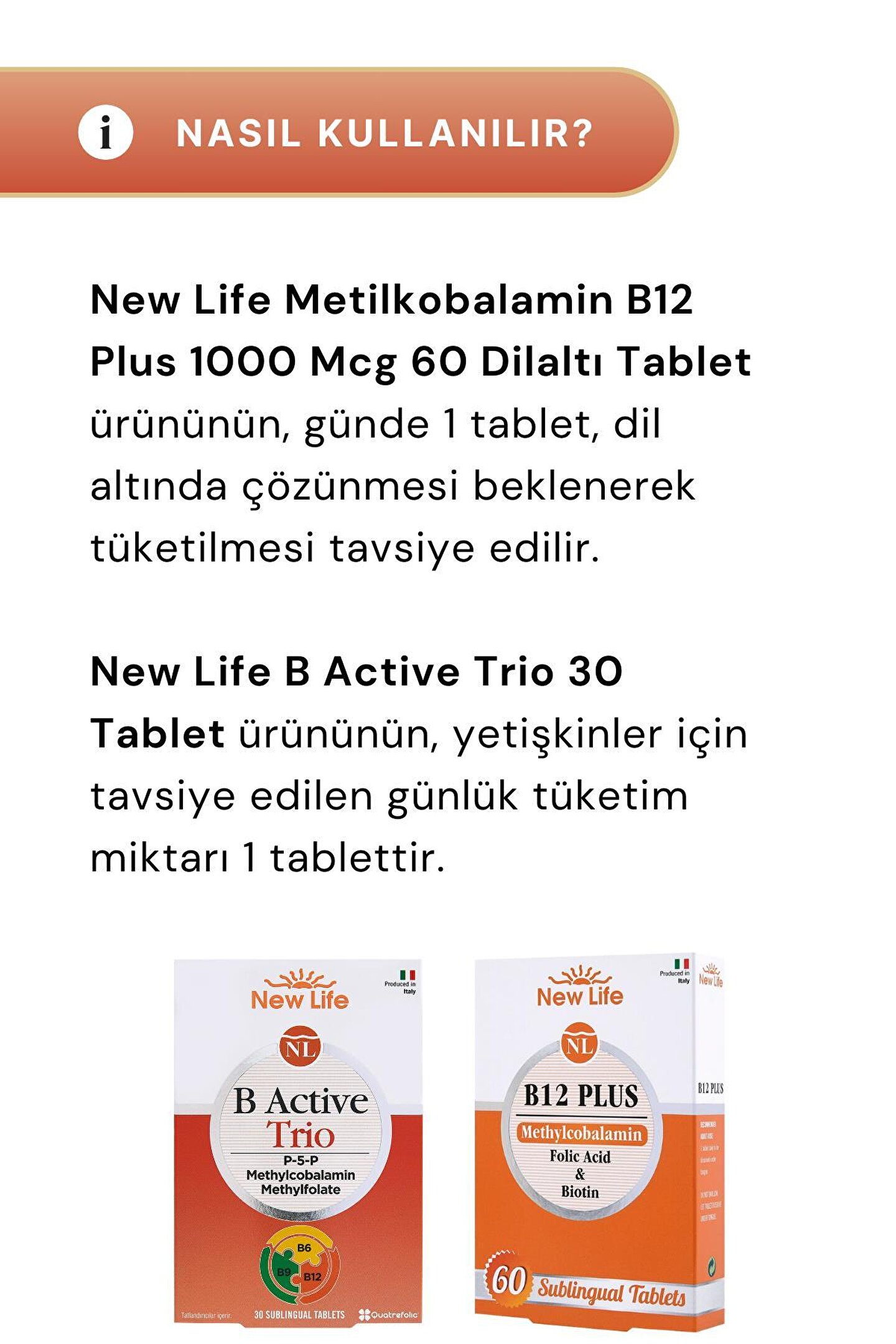 New Life Metilkobalamin B12 Plus 1000 Mcg 60 Dilaltı Tablet Nedir? New Life Metilkobalamin B12 Plus 1000 Mcg 60 Dilaltı Tablet metilkobalamin formunda B12 vitaminini, folik asit ve biotin ile formülize ettiği bir gıda takviyesidir. ; İçeriğindeki bileşenler sayesinde normal enerji oluşum metabolizmasına, bağışıklık sisteminin normal fonksiyonunun korunmasına ve saç, cilt ve mukozanın korunmasına yardımcı olur. ; New Life Metilkobalamin B12 Plus 1000 Mcg 60 Dilaltı Tablet ürününe benzer en iyi B12, Biotin ve Folik Asit takviyesi fiyatlarını görmek için inceleyin ve karşılaştırın. ; New Life B Active Trio Nedir? B Active Trio tek dil altı tablette P5P formunda B6 vitamini, metilkobalamin formunda B12 vitamini ve metilfolat formunda folik asit içermektedir. ; B Active Trio içerisinde bulunan B6, B12 vitamini ve folat normal kırmızı kan hücresi oluşumuna, bağışıklık sisteminin normal fonksiyonuna, normal homosistein metabolizmasına ve yorgunluk ve bitkinliğin azalmasına katkıda bulunmaktadır.;