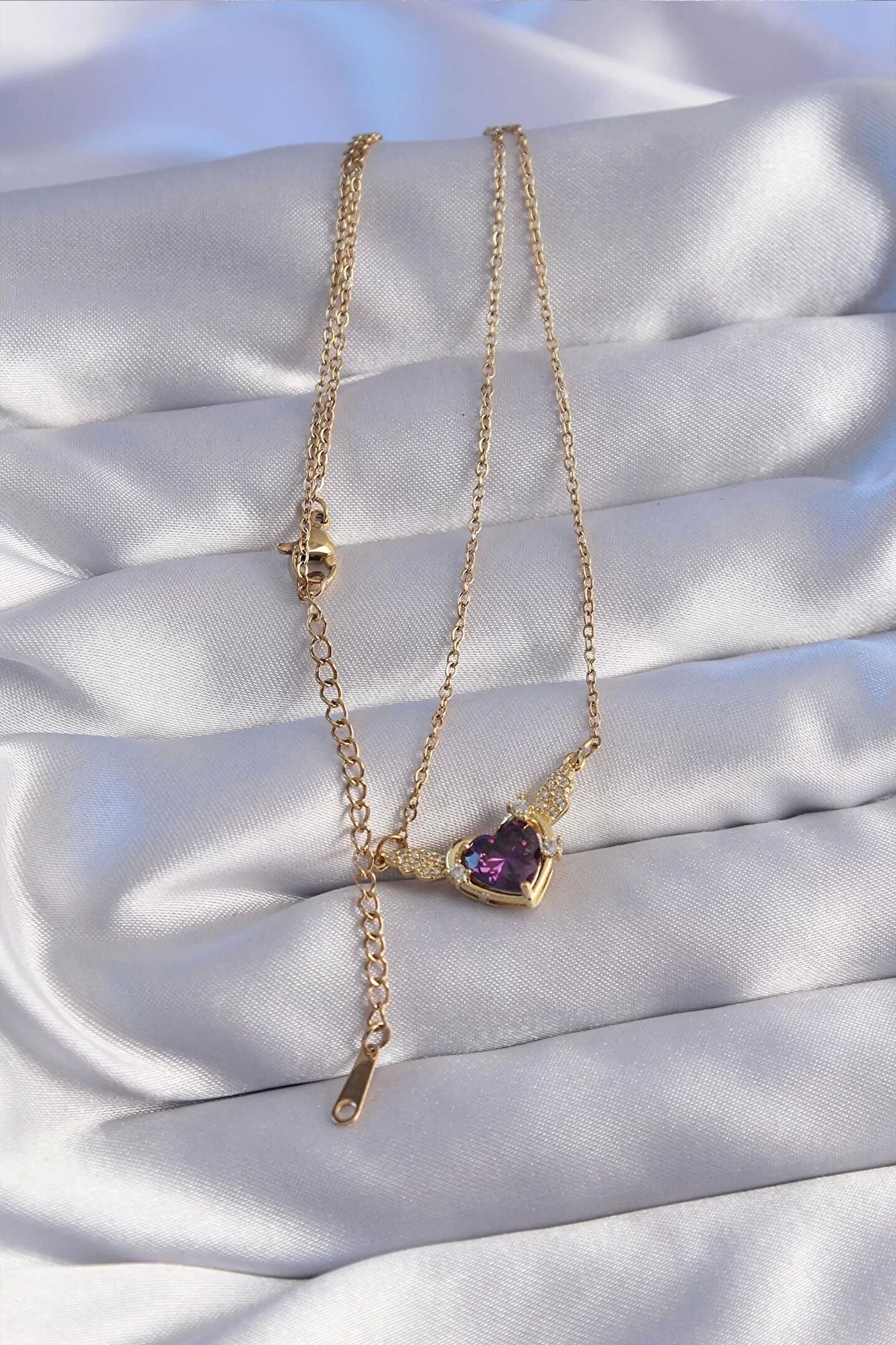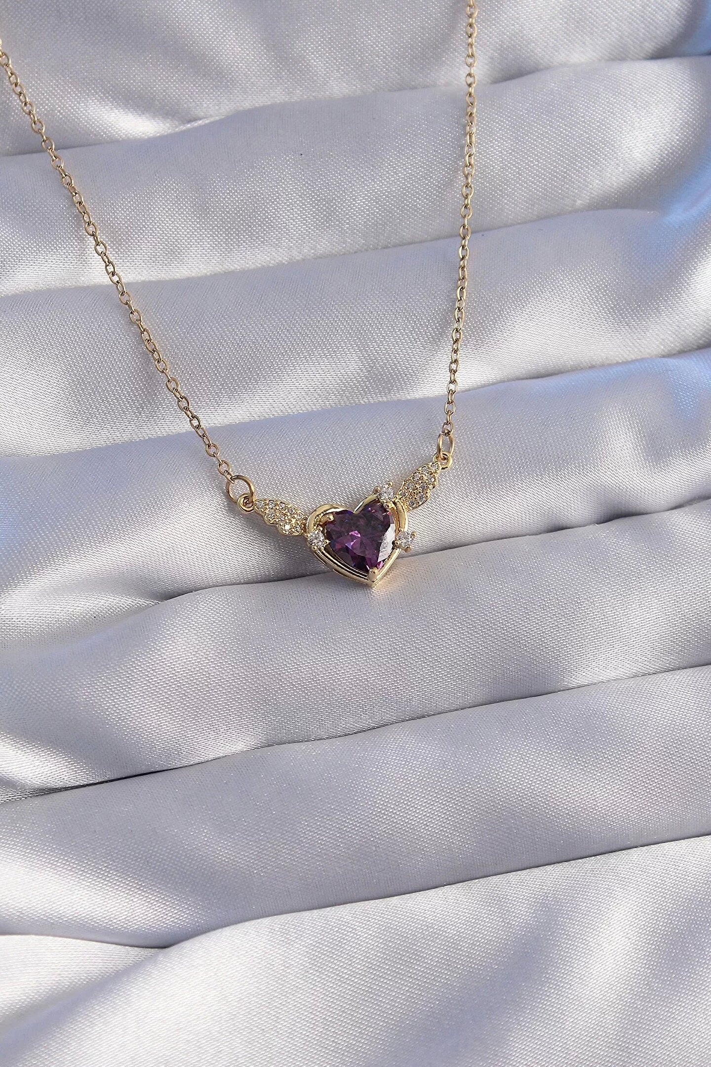316L Çelik Zincir Gold Renk Mor Zirkon Taşlı Kanatlı Kalp Kolye