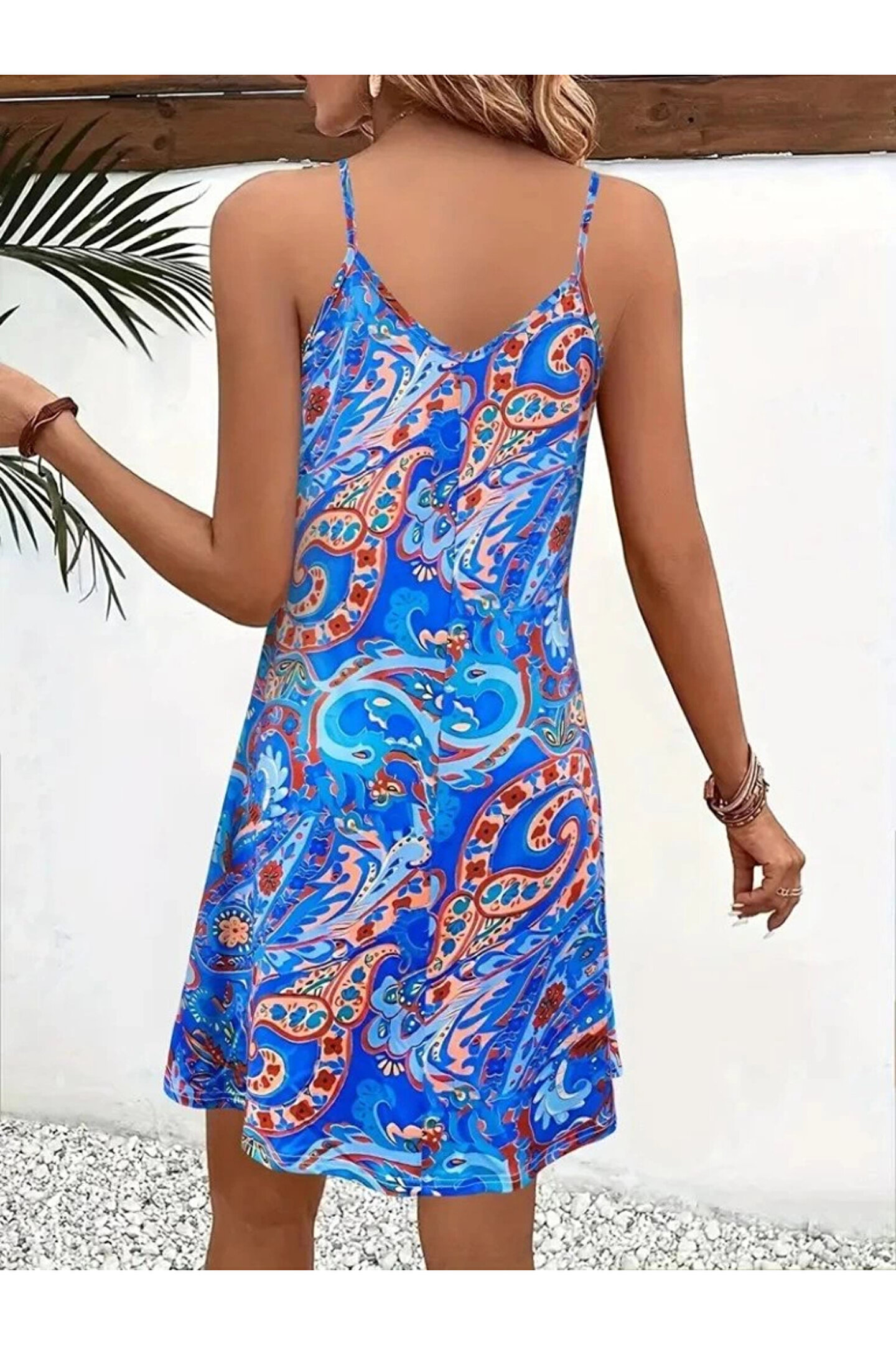 Kadın Ip Askılı V Yakalı Desenli Kısa Süprem Mini Elbise