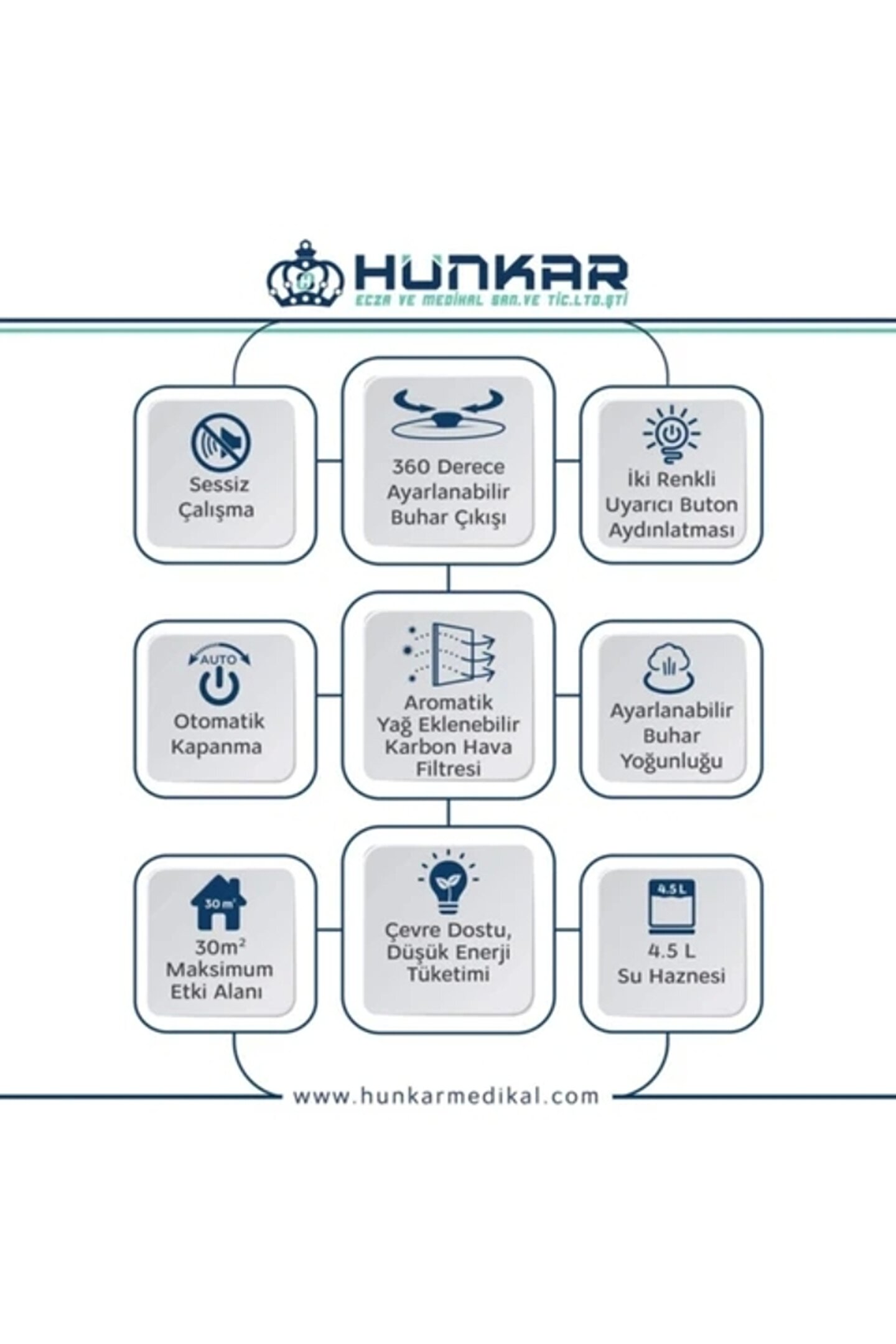 Ultrasonik teknolojisi sayesinde havadaki nem seviyesini hızla artırarak konforlu bir ortam oluşturur; Beyaz renk tasarımı ile modern ve şık bir görünüm sergiler, evinizin dekorasyonuna kolayca uyum sağlar;