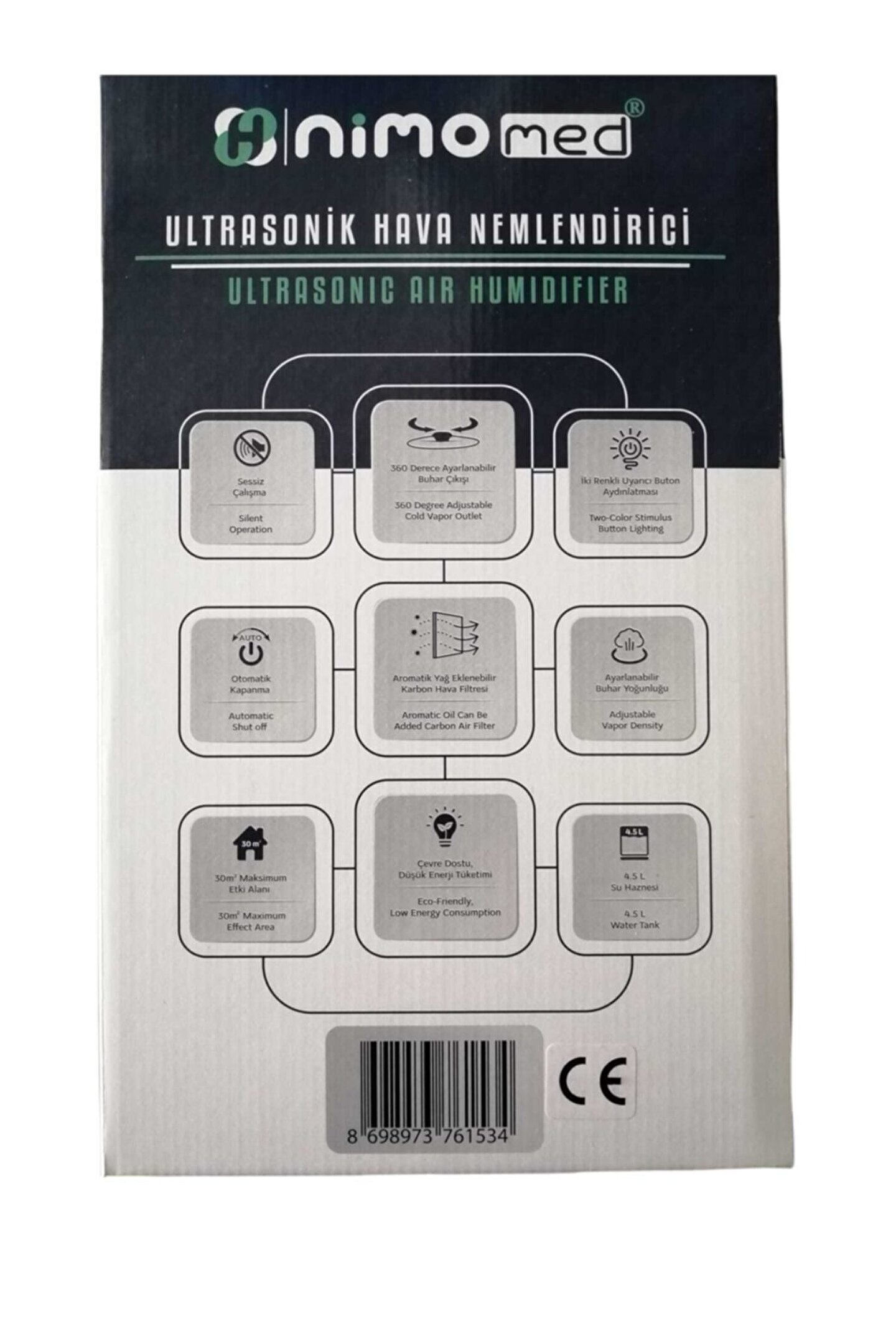 Nimo ultrasonik hava nemlendirici su buhar makinesi Saatte 250 ml buhar çıkış hızı ; Çıkarılabilir su haznesi ; Çalışırken yukarıdan su ekleyebilme özelliği ; Ultra sessiz çalışma teknolojisi 45'den düşük ; Su azaldığında otomatik kapanma ; Kullanım ve temizlik kolaylığı ; 360 derece ayarlanabilir buhar çıkışı ; Iki renkli uyarıcı buton aydınlatması ; Aromatik yağ eklenebilir karbon hava fitresi ; Ayarlanabilir buhar yoğunluğu ; 30 metrekare etki alanı ; Çevre dostu düşük enerji tüketimi ; 4.5 l su haznesi ; Nimo hava nemlendircisi Soluduğunuz havayı hem iyonizer ; Özelliğiyle temizler, hem nemlendirir. ; Solunum yolu rahatsızlıklarını, ve öksürüğü engellemede yardımcı olur. ; Rahat ve konforlu uyuma sağlar, sabah dinlenmiş kalkmanızı sağlar. ; Solunum yolu enfeksiyonlarından korur. ; Havanın kalitesini arttırır. ; Statik elektriği giderir ; Negatif iyonlar hava kirliliğine neden olan toz zerrelerini, havadaki bakterileri, mikropları, tozları, alerjik maddeleri ve küfleri azaltarak havanın kalitesini arttırır. ; Soluk almayı kolaylaştırır. ; Statik elektrik yükünü azaltır. ; ;