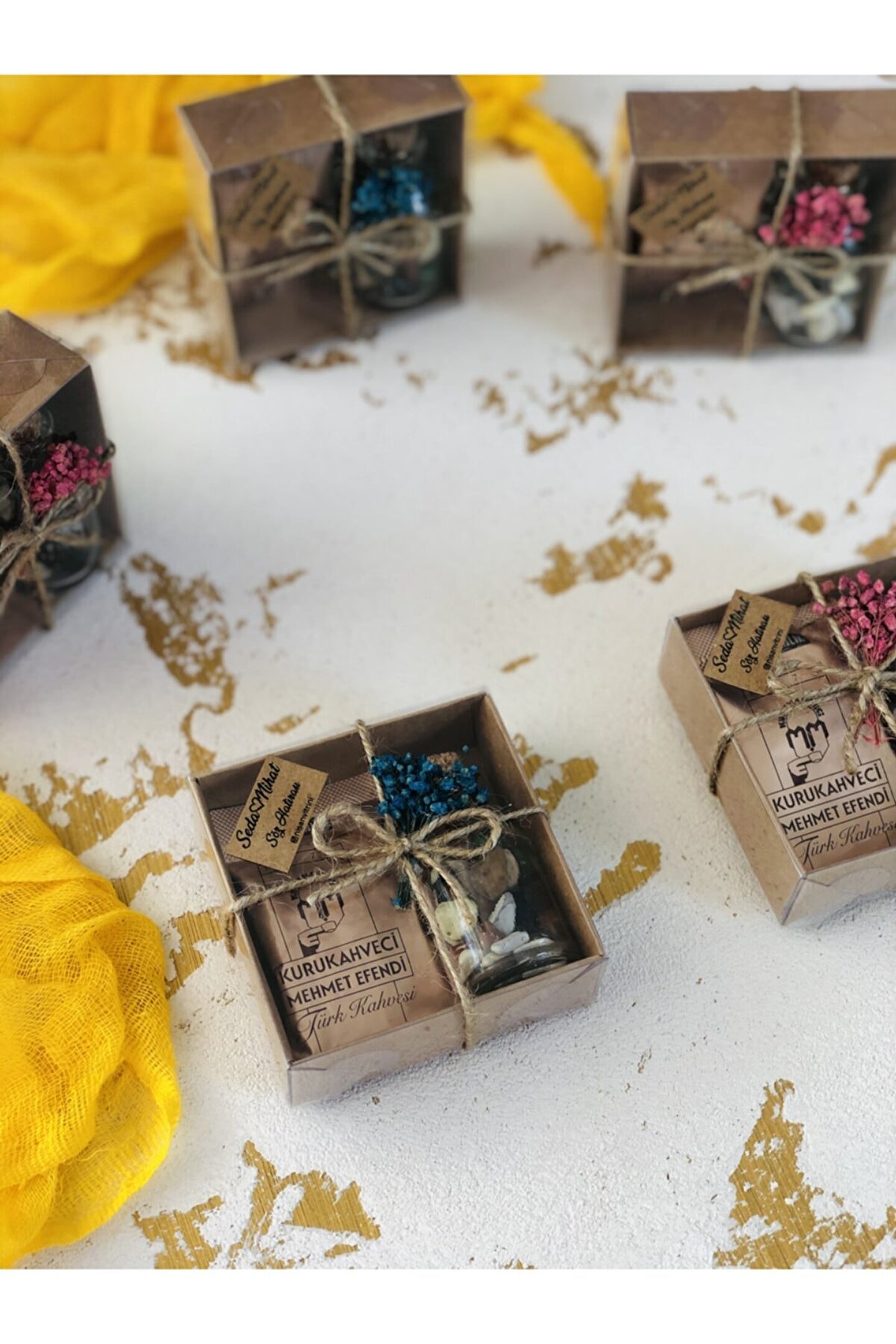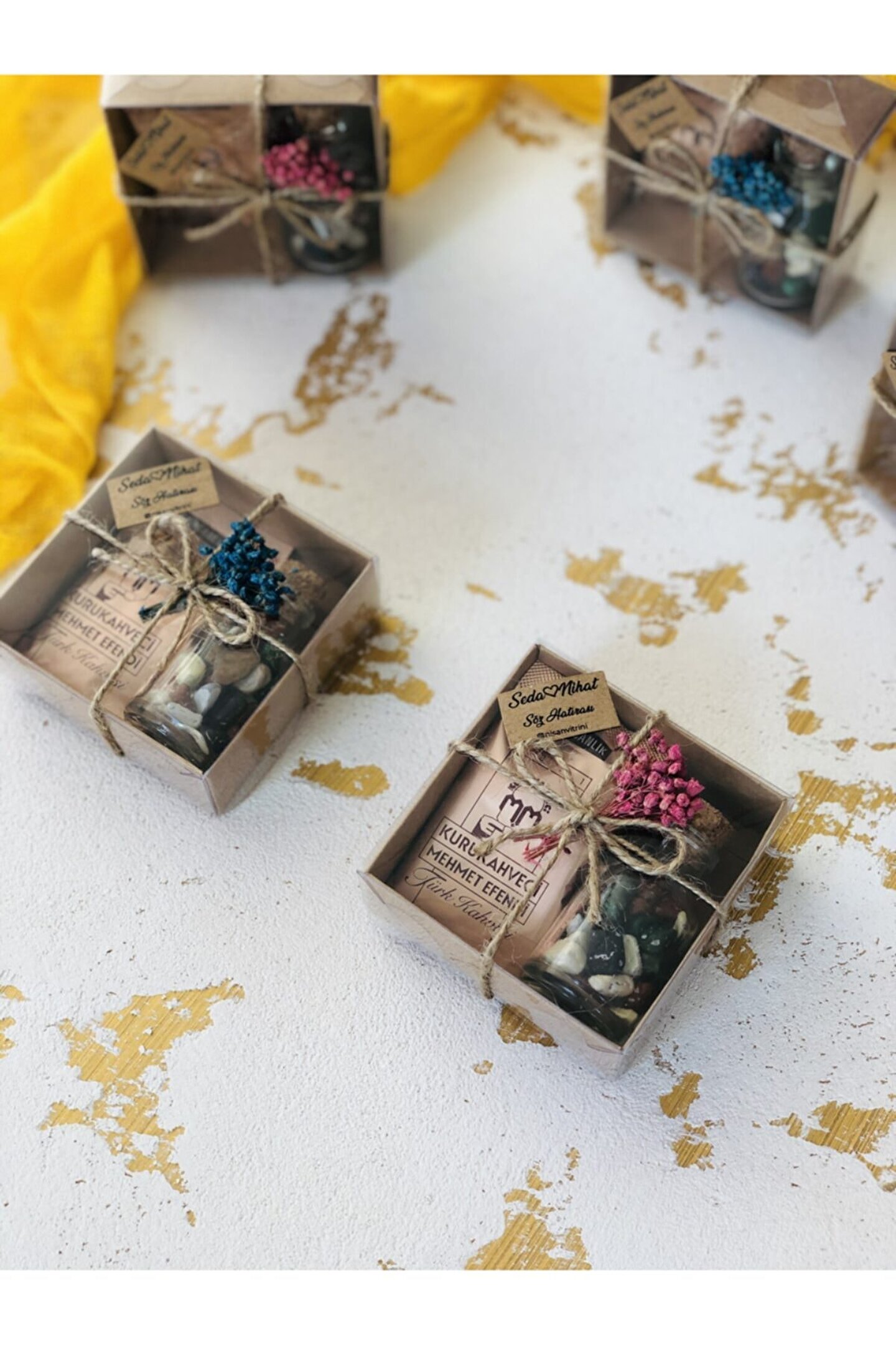 Kraft kutu içerisinde; ; 1 adet 6gr Mehmet Efendi Türk Kahvesi. 1 adet 25cc çakıl taşı çikolata şişesi bulunmaktadır. Kutunun dış kısmı doğal cipso çiçek süslemeli ve jüt ip kurdelelidir. ; Ürün fotoğrafta görüldüğü gibi süslenmiş olarak gönderilmektedir. ; Kutu boyutu 8 x 8 x 3 cmdir. ; Verilen toplam fiyat 20 adet içindir. ;