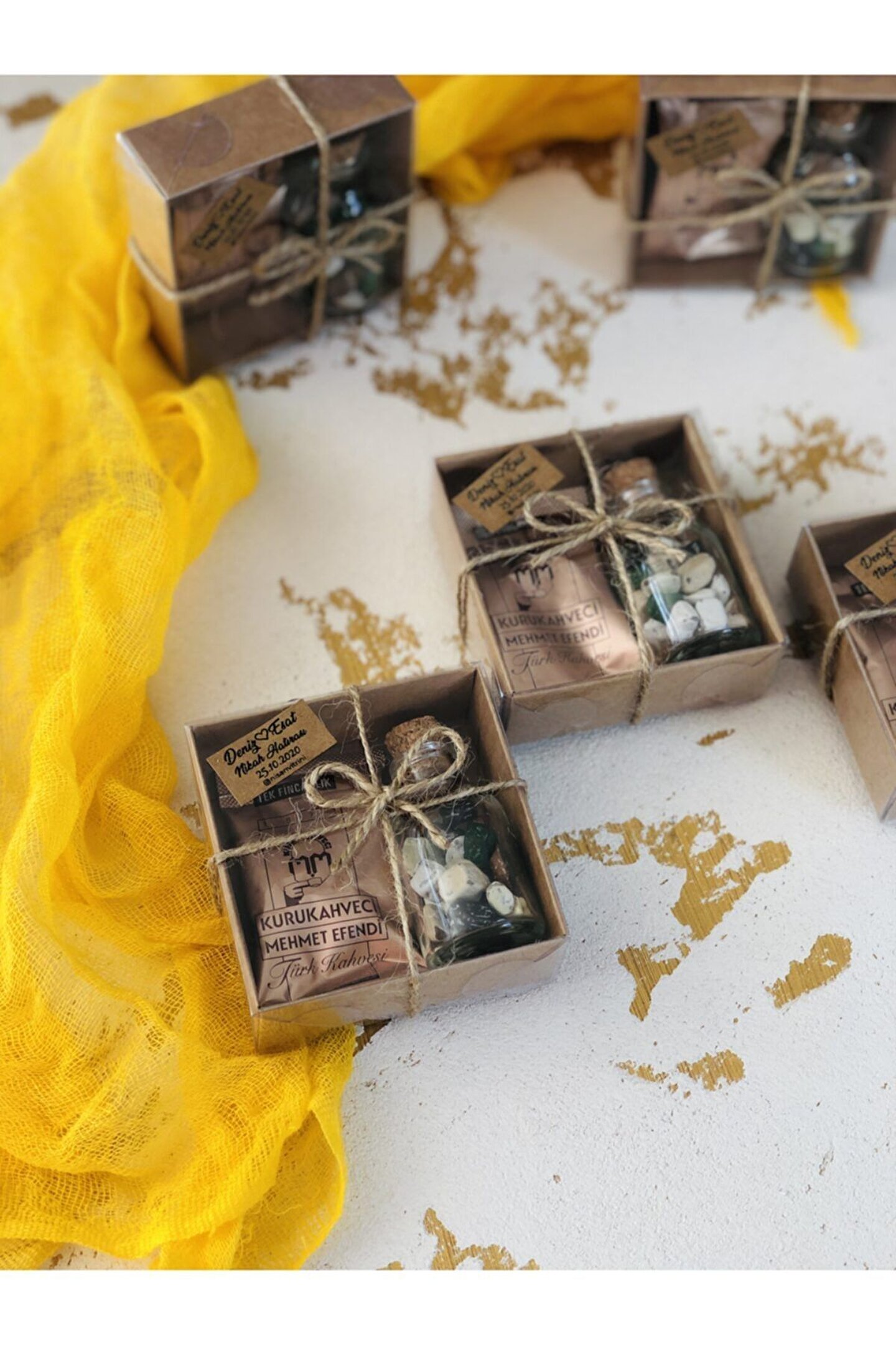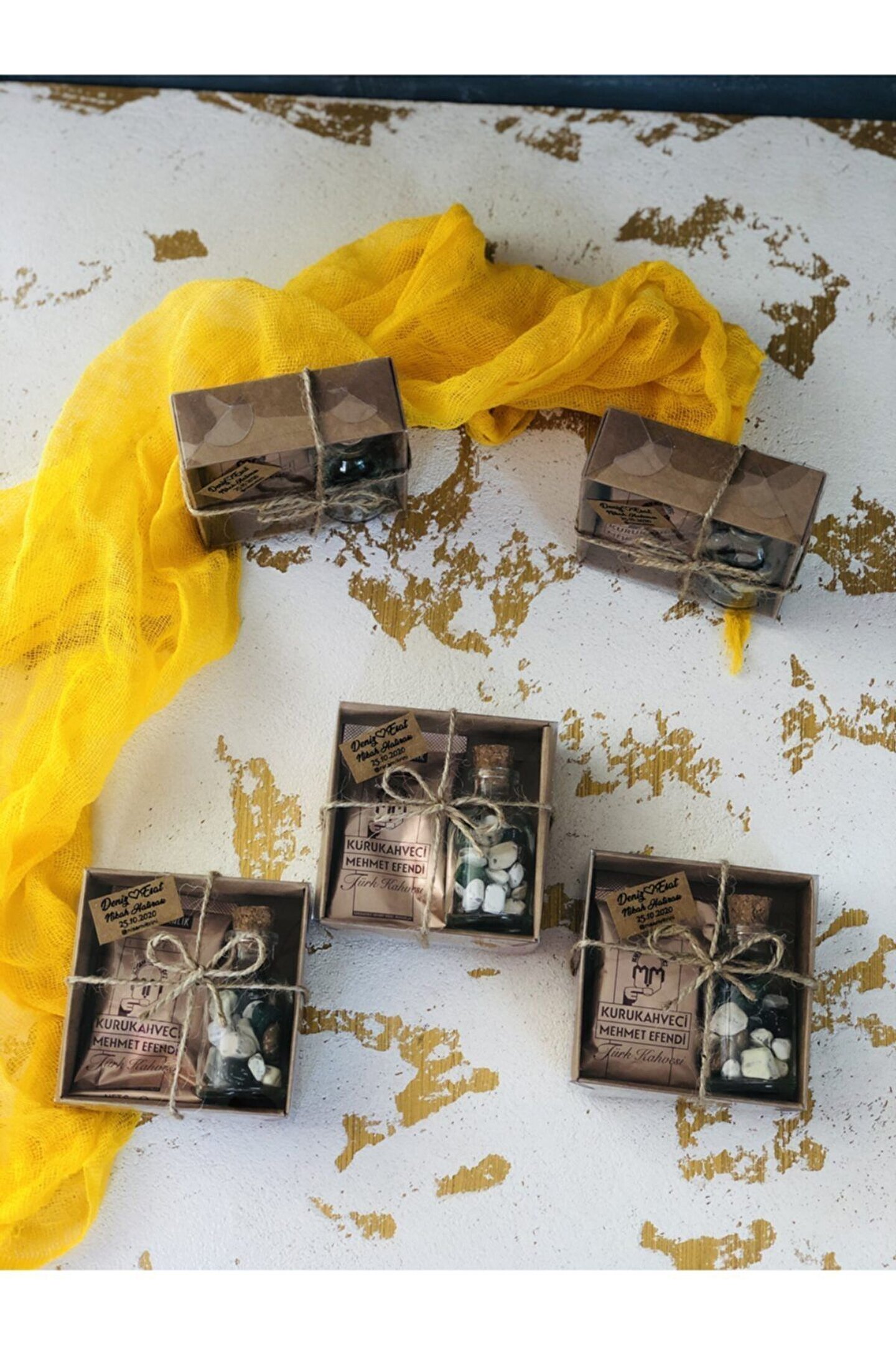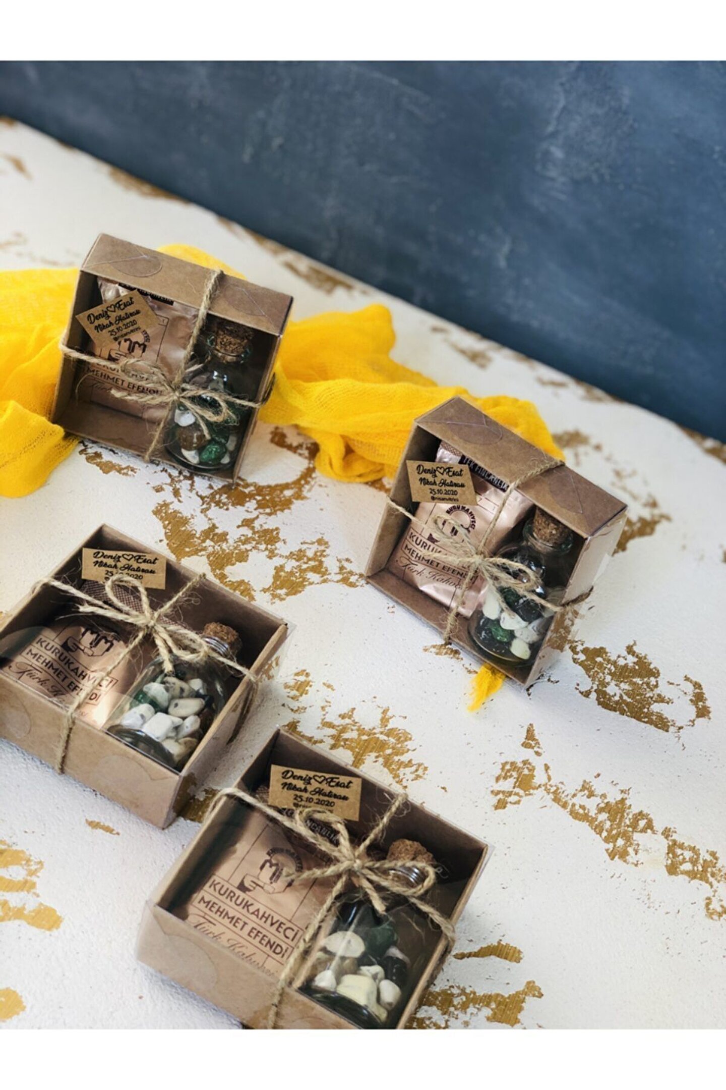 Kraft kutu içerisinde 1 adet 6gr Mehmet Efendi Türk Kahvesi, 1 adet 25cc çakıl taşı çikolata şişesi bulunmaktadır.; Kutunun dış kısmı jüt ip kurdelelidir.; Ürün fotoğrafta görüldüğü gibi süslenmiş olarak gönderilmektedir.; Kutu boyutu 8 x 8 x 3 cmdir.; Verilen toplam fiyat 25 adet içindir.;