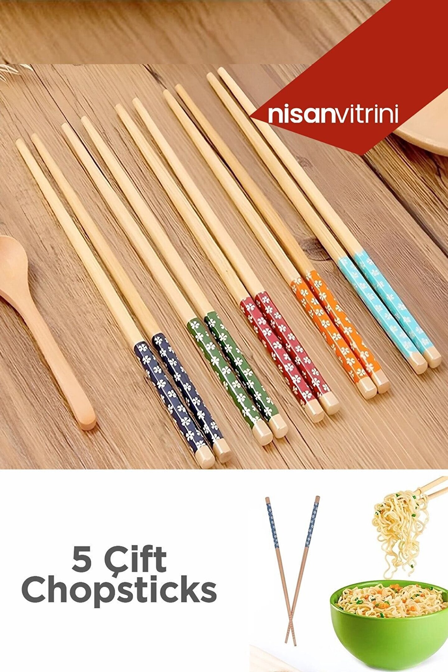 Bambu Chopstick 5 Çift Desenli Ve Yıkanabilir Çin Kore Çubukları - Sushi, Ramen Noodle Çubuğu