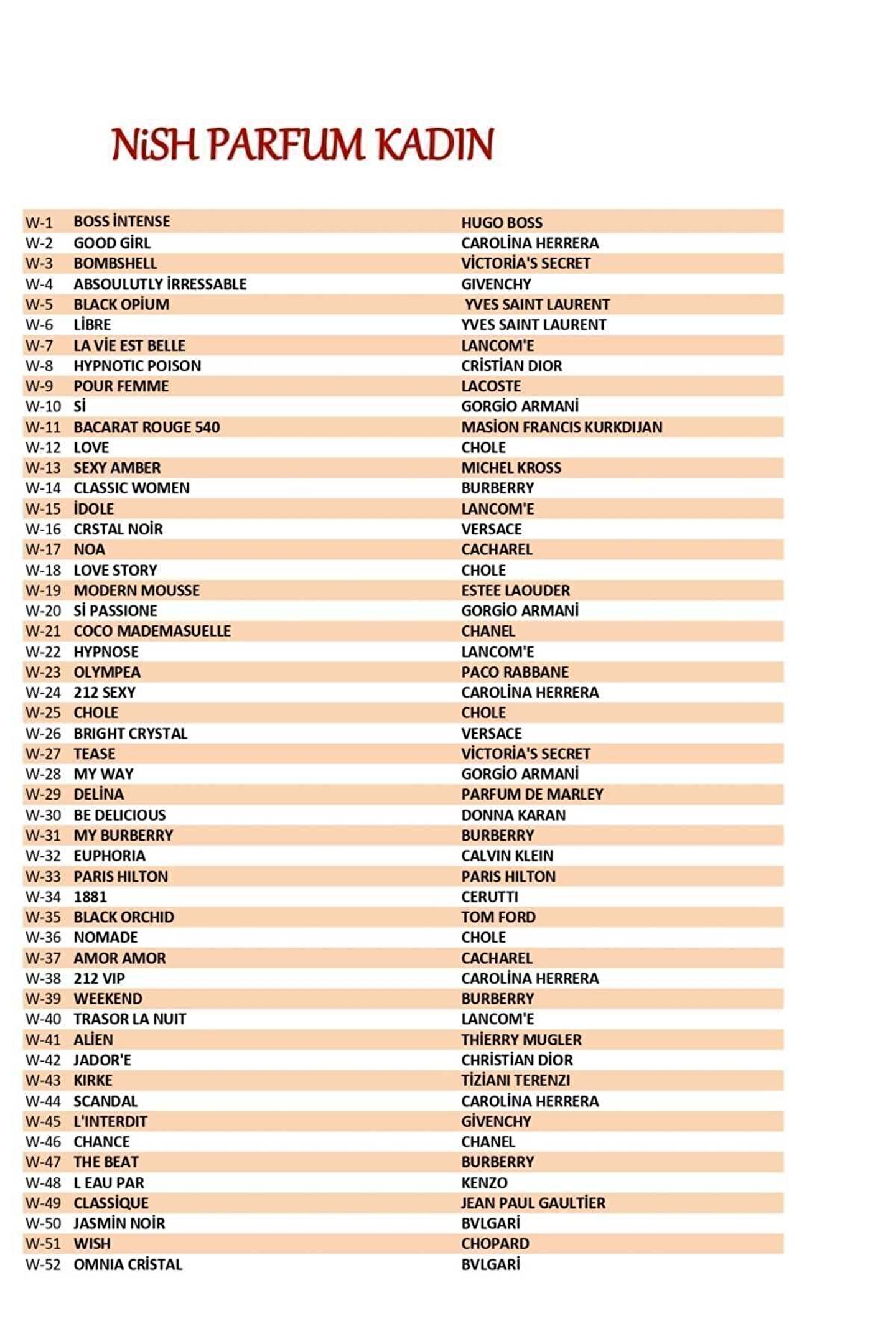 Üst Notalar:Mimoza, Gül, Süsen, Frezya, Menekşe, İnciçiçeği, Yasemin, Bergamot Orta Notalar:Papatya, Süsen, Nergis, Sardunya, Kasnıotu Sakızı, Yasemin, Kişniş, Gül Ağacı, Portakal Çiçeği Alt Notalar:Musk, Sandal Ağacı, Sedir Ağacı, Amber, Vanilya W-34 Kodlu Parfüm Cerutti 1881 Muadili --Extrait De Parfüm en Az %30 Esans Oranı --Yoğun Kalıcı -- Vegan --Sağlık Bakanlığı Onaylı --Uts Kayıtlı --Helal Sertifikalı Nish Parfum - Kalıcı ve Eşsiz Parfüm DeneyimiNish Parfum, sizi benzersiz kokularla tanıştırıyor! Kaliteli esanslar kullanılarak özenle üretilen bu parfüm, gün boyu süren kalıcılığı ve çarpıcı kokusuyla fark yaratıyor.; Özel formülü sayesinde her tene uyum sağlar ve unutulmaz bir iz bırakır.; Neden Nish Parfum'ü Seçmelisiniz?Kalıcı Koku: Gün boyu etkileyici bir parfüm deneyimi.; Doğal Esanslar: En kaliteli ve doğal içeriklerle hazırlanmış özel formül.; Unisex Seçenekler: Hem kadınlar hem erkekler için özel olarak tasarlanmış parfüm seçenekleri.; Zarif Şişe Tasarımı: Şıklığıyla göz kamaştıran modern ve zarif şişe tasarımı.; Bu koku, sıradanlıktan uzaklaşıp kendi stilinizi yansıtmanın mükemmel bir yolu! Parfümünüzü tamamlayan sofistike ve çarpıcı bir kokuya sahip olun.; Nish Parfum ile kokunuz da imzanız kadar unutulmaz olsun.