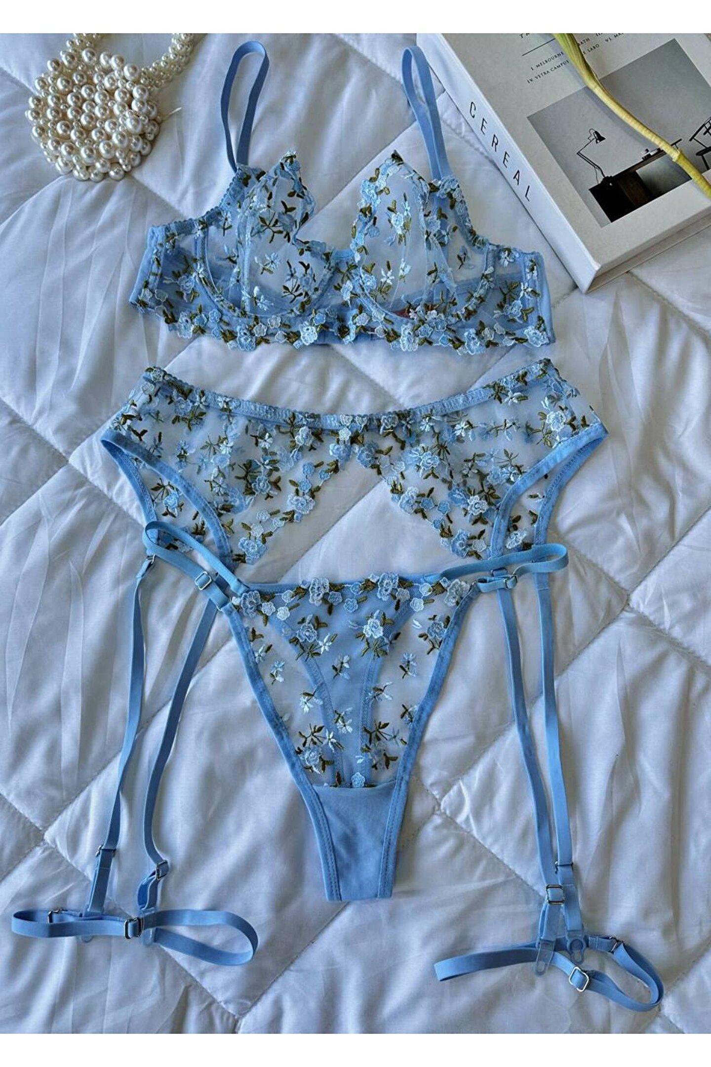 • Zarafetin en romantik hâlini taşıyan üçlü jartiyer setimiz, ince işçiliği ve çiçek nakışlı tül detaylarıyla gardırobunuzun en özel parçalarından biri olmaya aday.