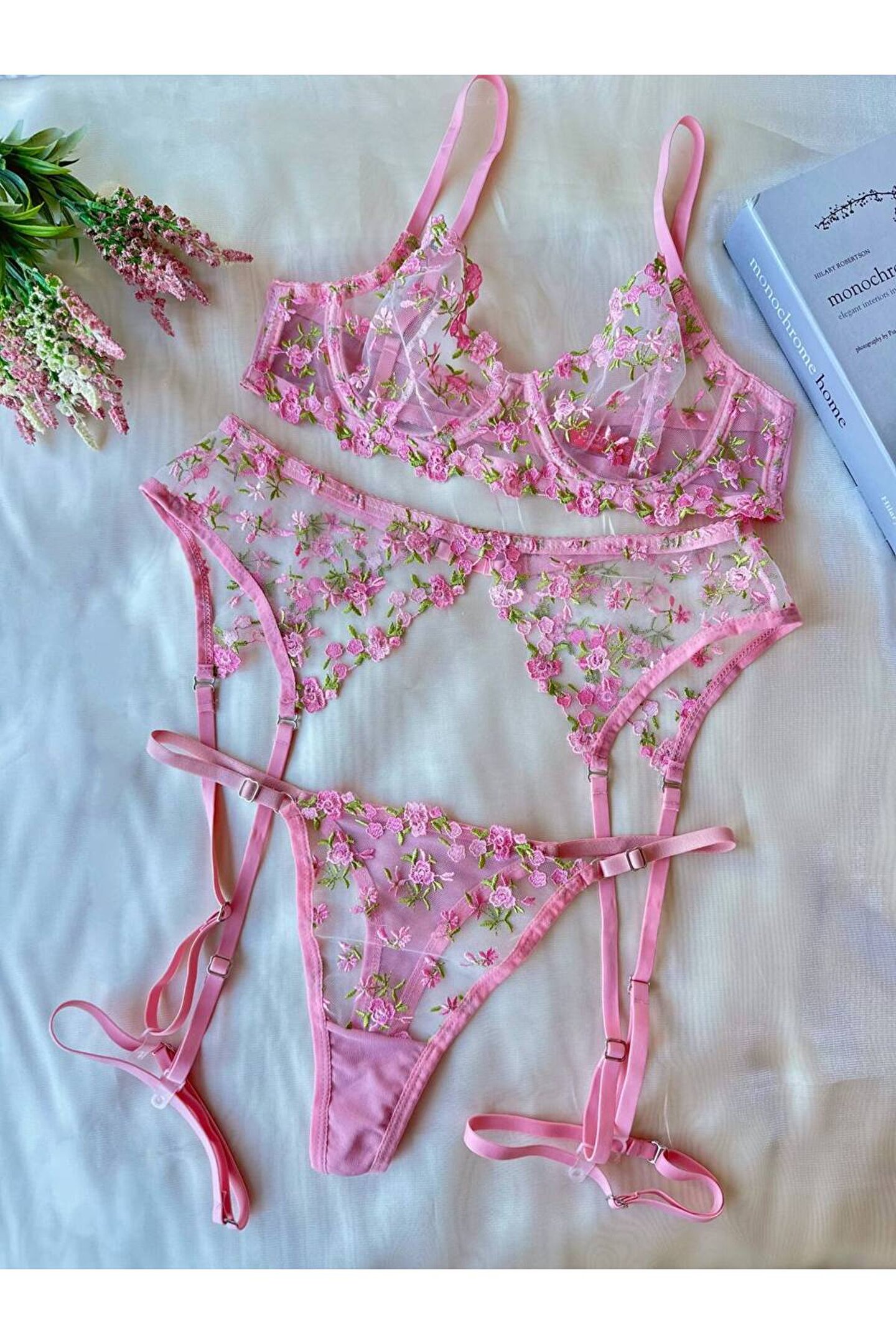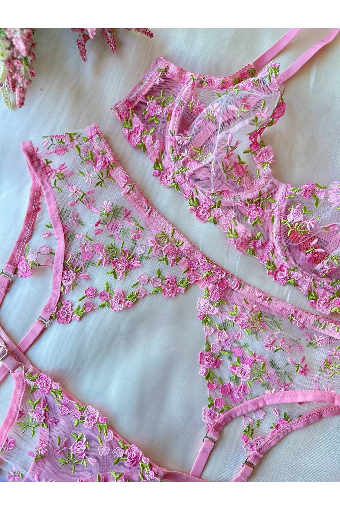 Zarafetin en romantik hâlini taşıyan üçlü jartiyer setimiz, ince işçiliği ve çiçek nakışlı tül detaylarıyla gardırobunuzun en özel parçalarından biri olmaya aday.
