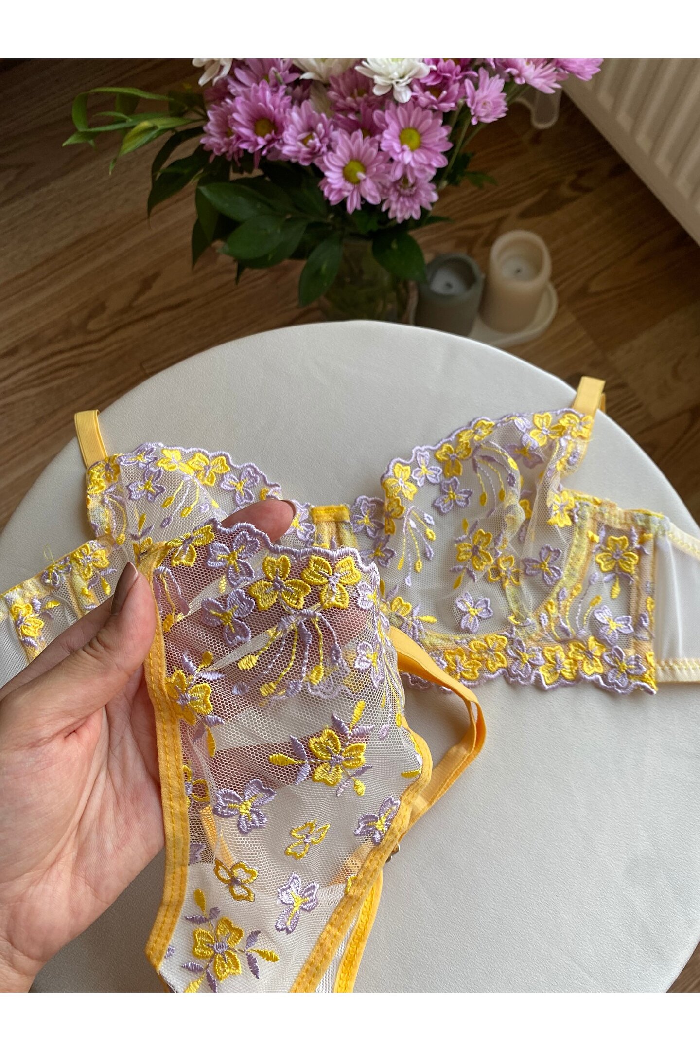 Sarı ve lilanın büyüleyici uyumuyla hazırlanmış çiçek işlemeli tül bralet takım, zarif ve romantik detaylarıyla iç giyim koleksiyonunuzun en özel parçalarından biri olmaya aday.; ; Hafif yapısı, yumuşak dokusu ve esnek formu sayesinde hem günlük kullanıma hem de özel anlara mükemmel uyum sağlar.; ; Transparan tül üzerine işlenen çok renkli çiçek motifleri, feminen bir görünüm sunarken; braletin rahat kalıbı ile gün boyu konfor sağlar.; ; Takımın uyumlu külodu ise aynı zarif işlemelerle bütünlüğü tamamlar.; ; Çiçek işlemeli tül detaylar ; Yumuşak yapılı ; Esnek ve rahat kalıp ; Hafif ve nefes alabilir kumaş ; Tamamlayıcı uyumlu külot ; Günlük kullanım ve özel günler için ideal ;