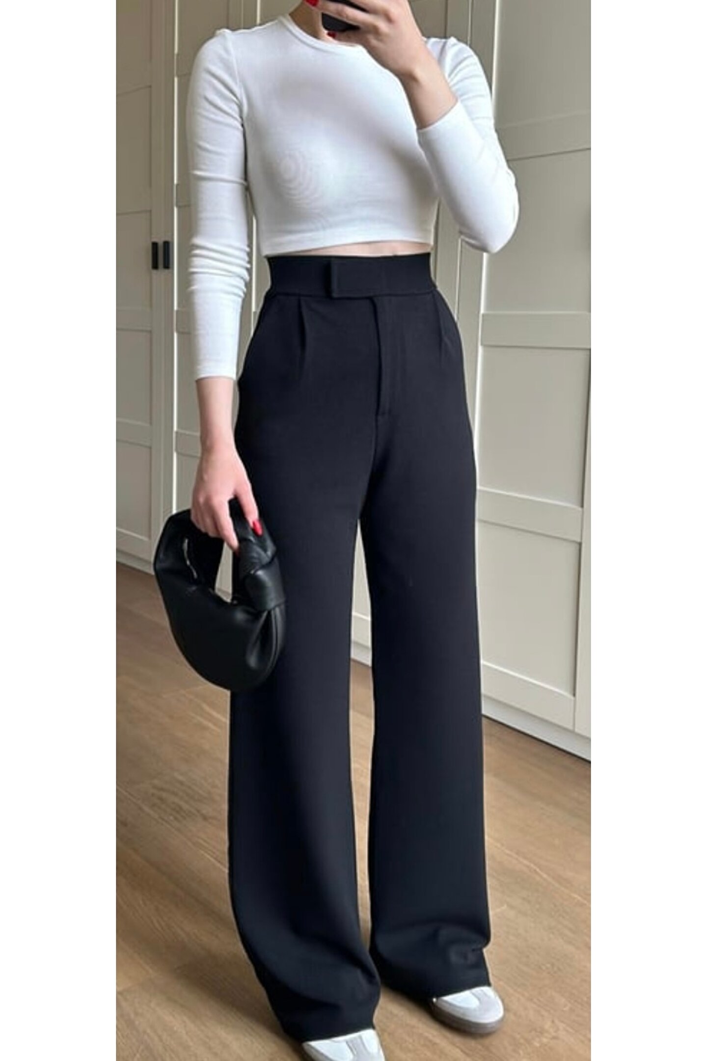 Noa Noa Yüksek Bel Cırt Cırtlı Siyah Bol Paça Cepli En Boy Likralı Rahat Kalıp Kumaş Pantolon Kadın Pileli