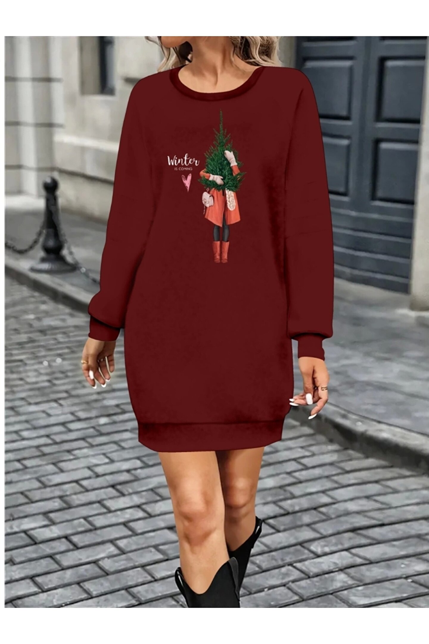 Kadın Uzun Kollu Bisiklet Yaka Desenli Kısa Viskon Iki Iplik Elbise