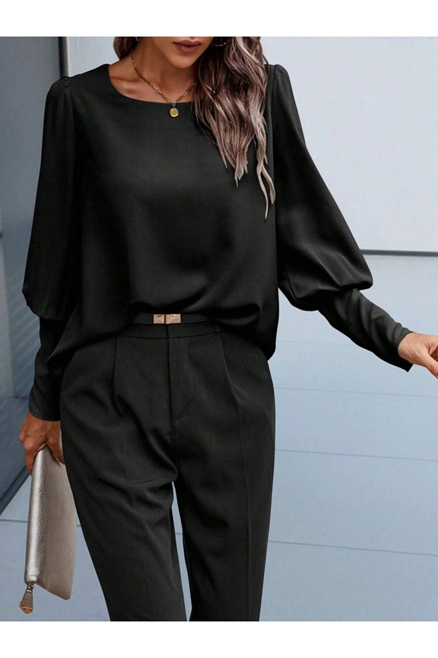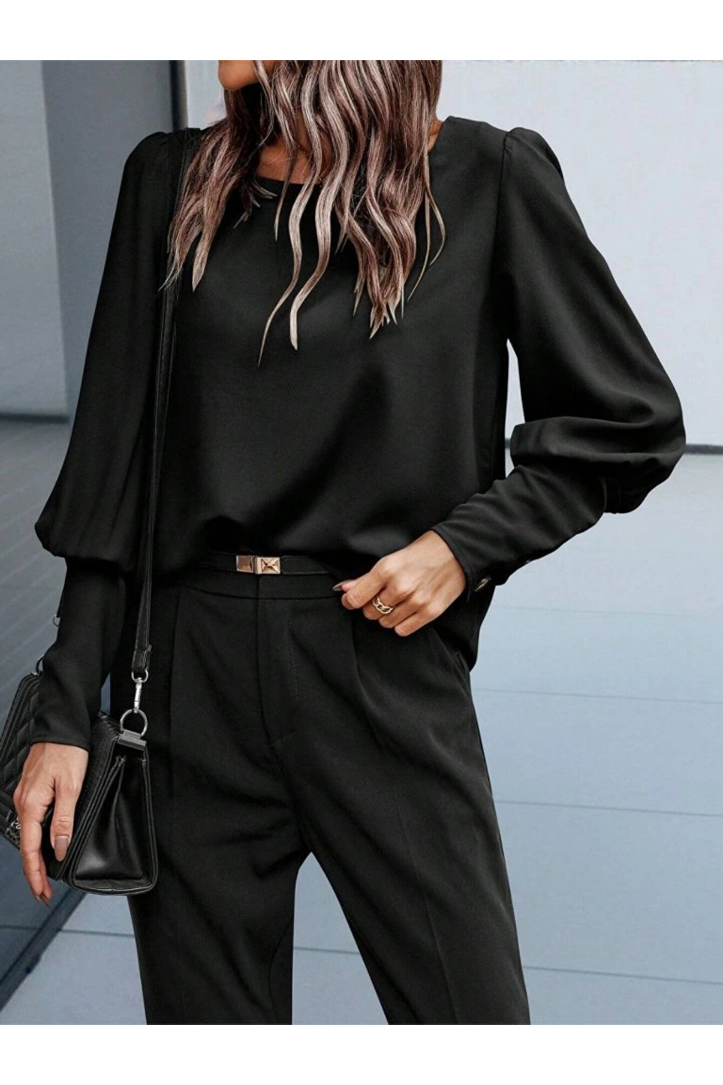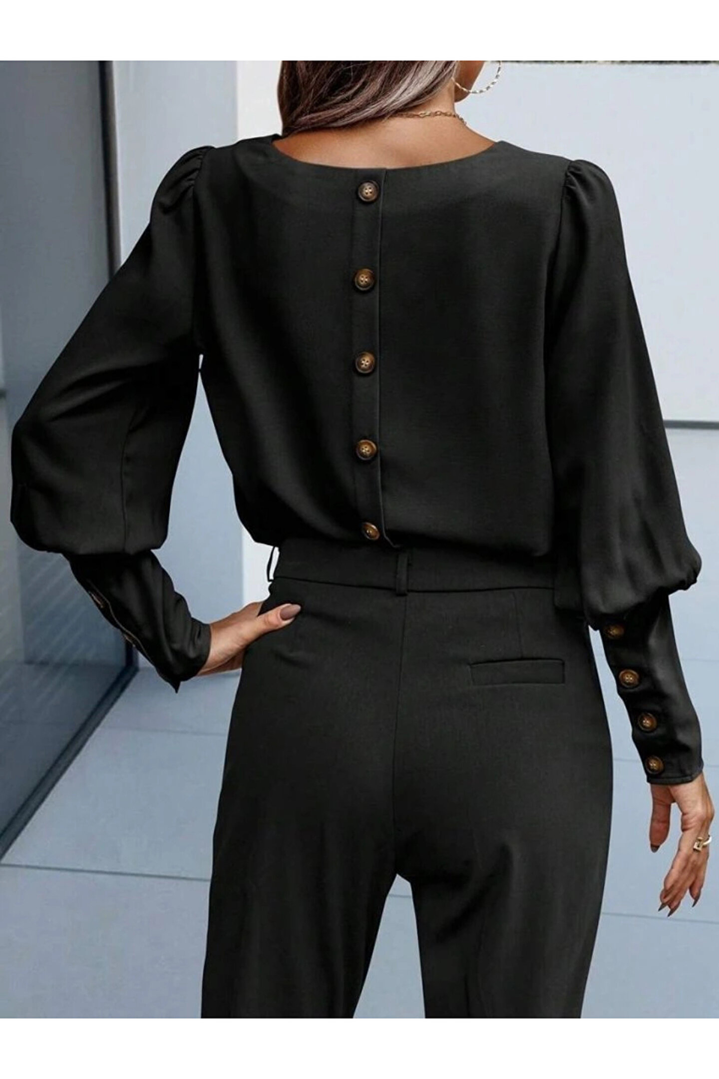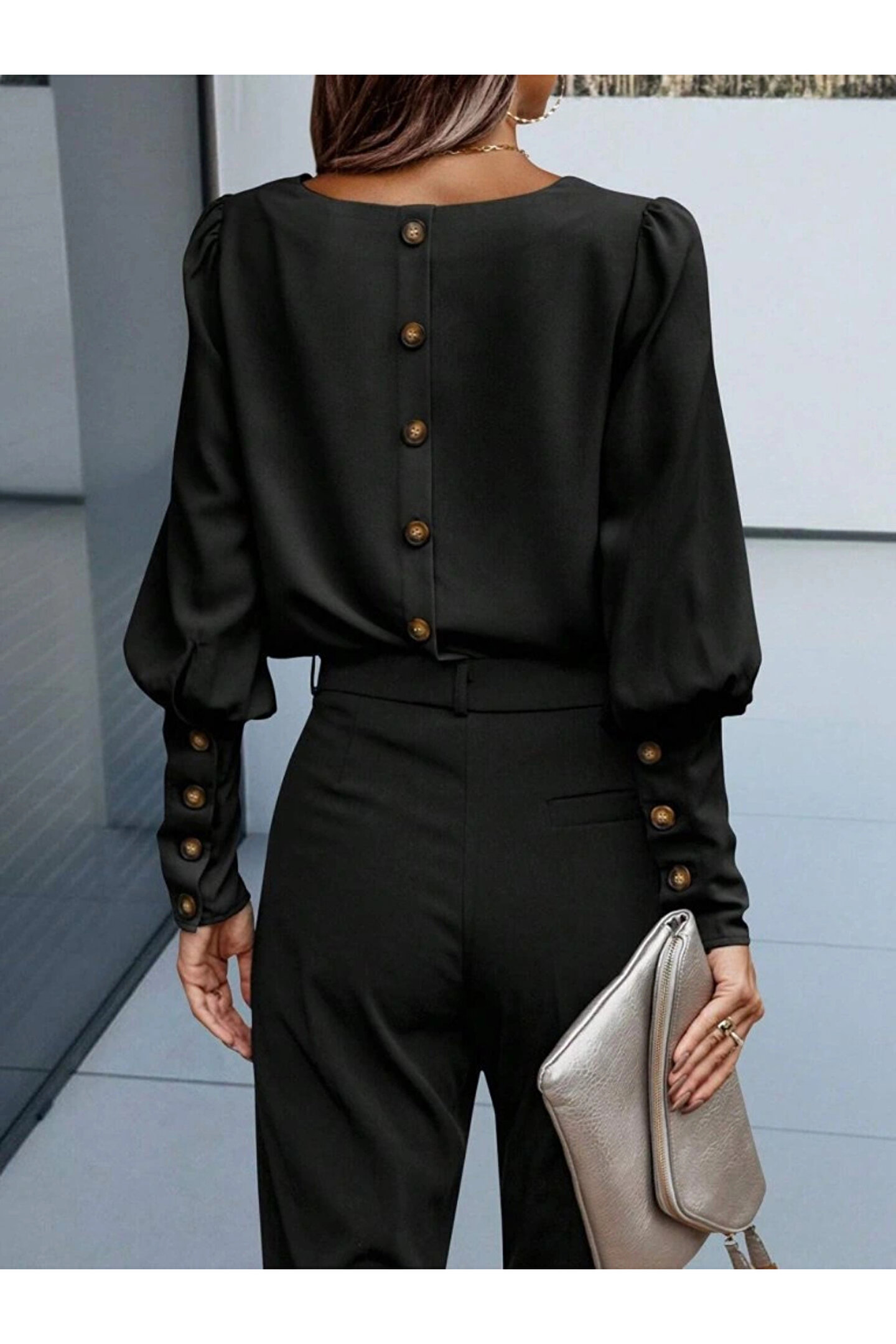 NOİR & GOLD Kadın Uzun Kollu Yuvarlak Yakalı Düğmeli Ithal Krep Bluz