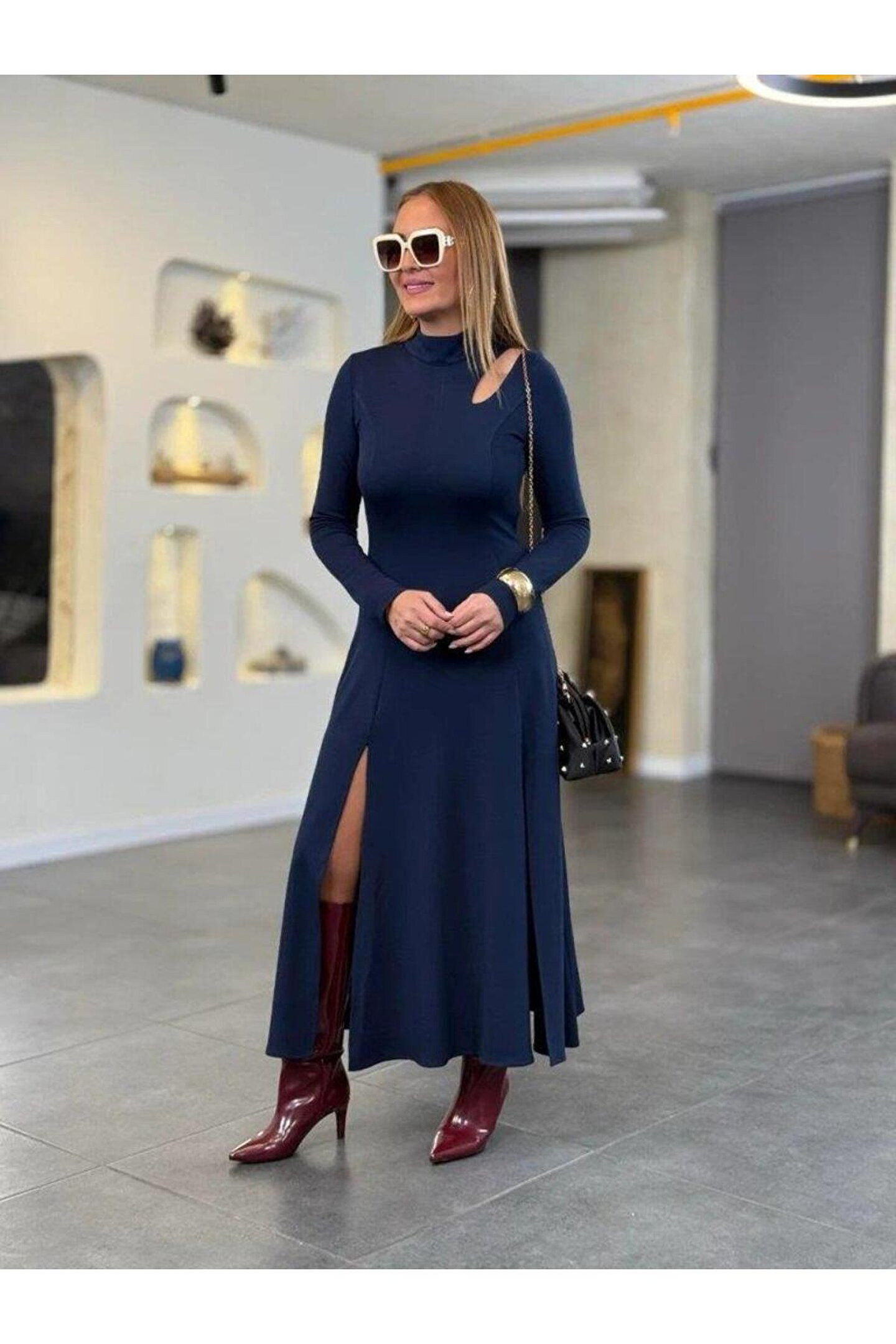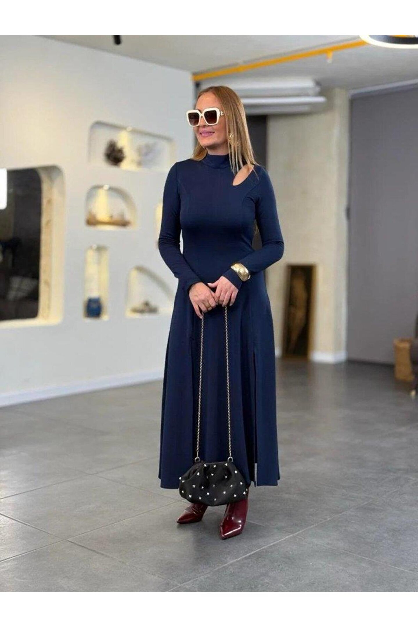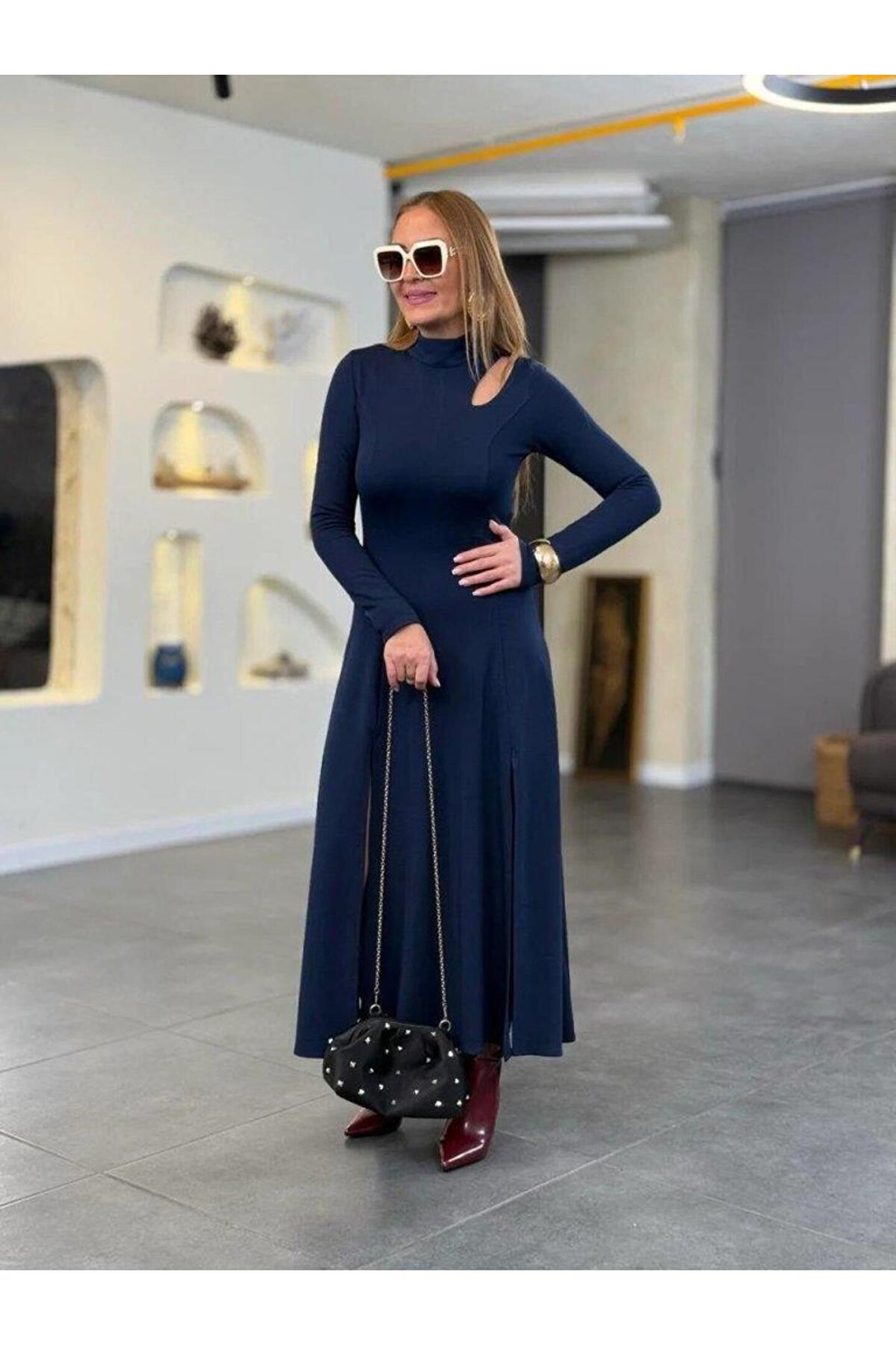 NORA Boutique Kadın Balıkçı Yaka Damla Detaylı Yırtmaçlı Uzun Viskon Iki Iplik Maxi Elbise