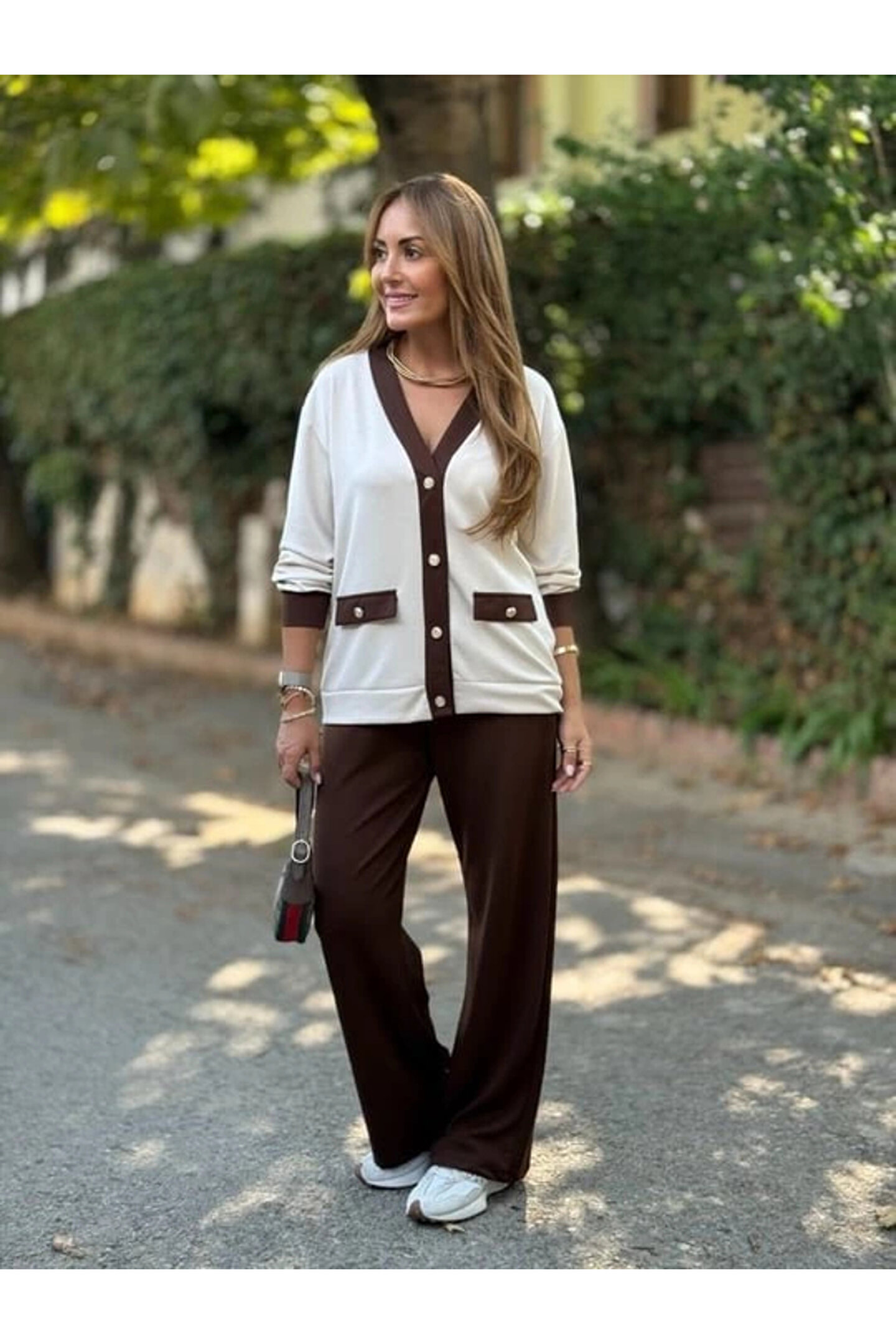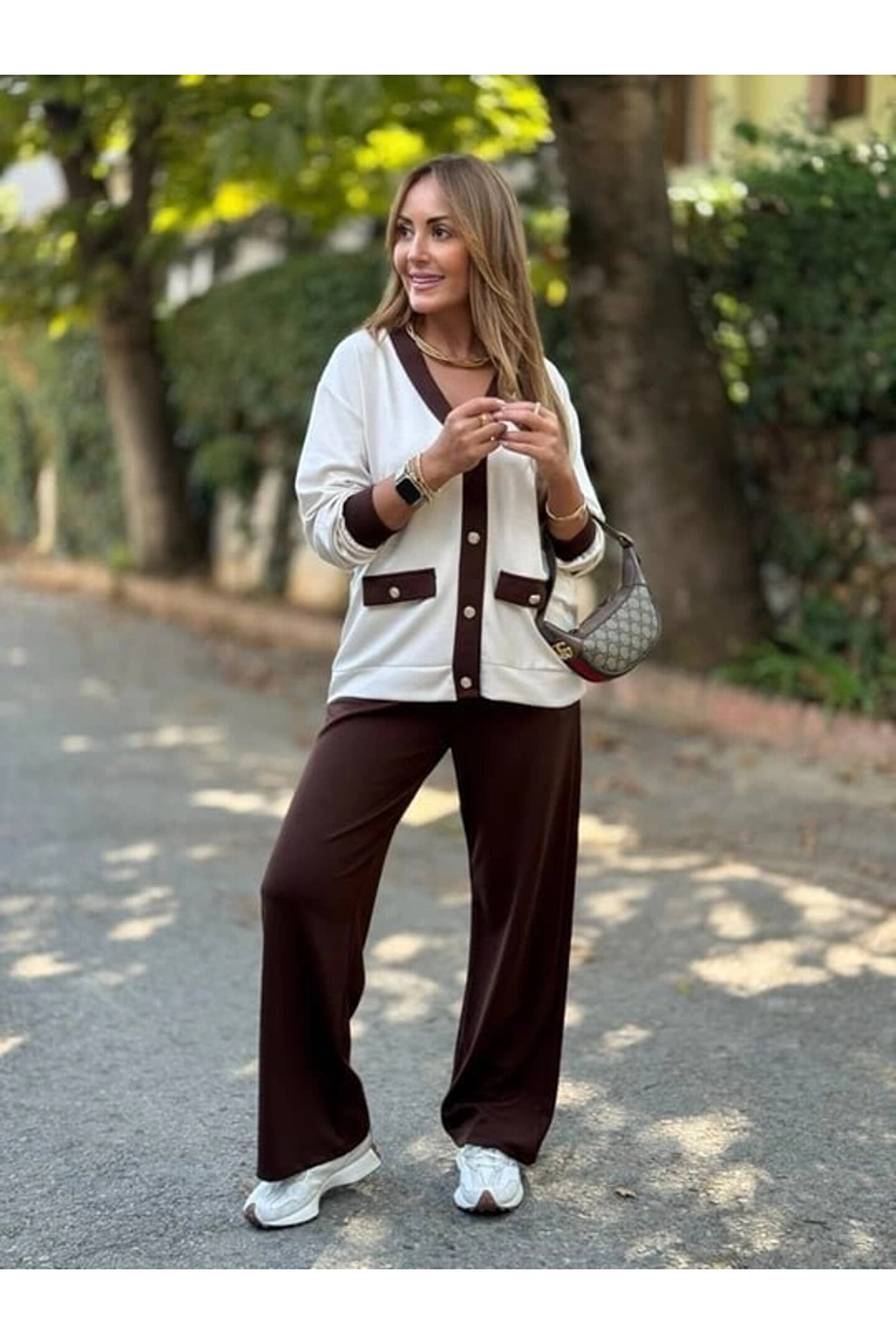 NORA Boutique Kadın Uzun Kollu Ribanali Cep Detay Hırka Ve Bol Paça Pantolon Ikili Takım