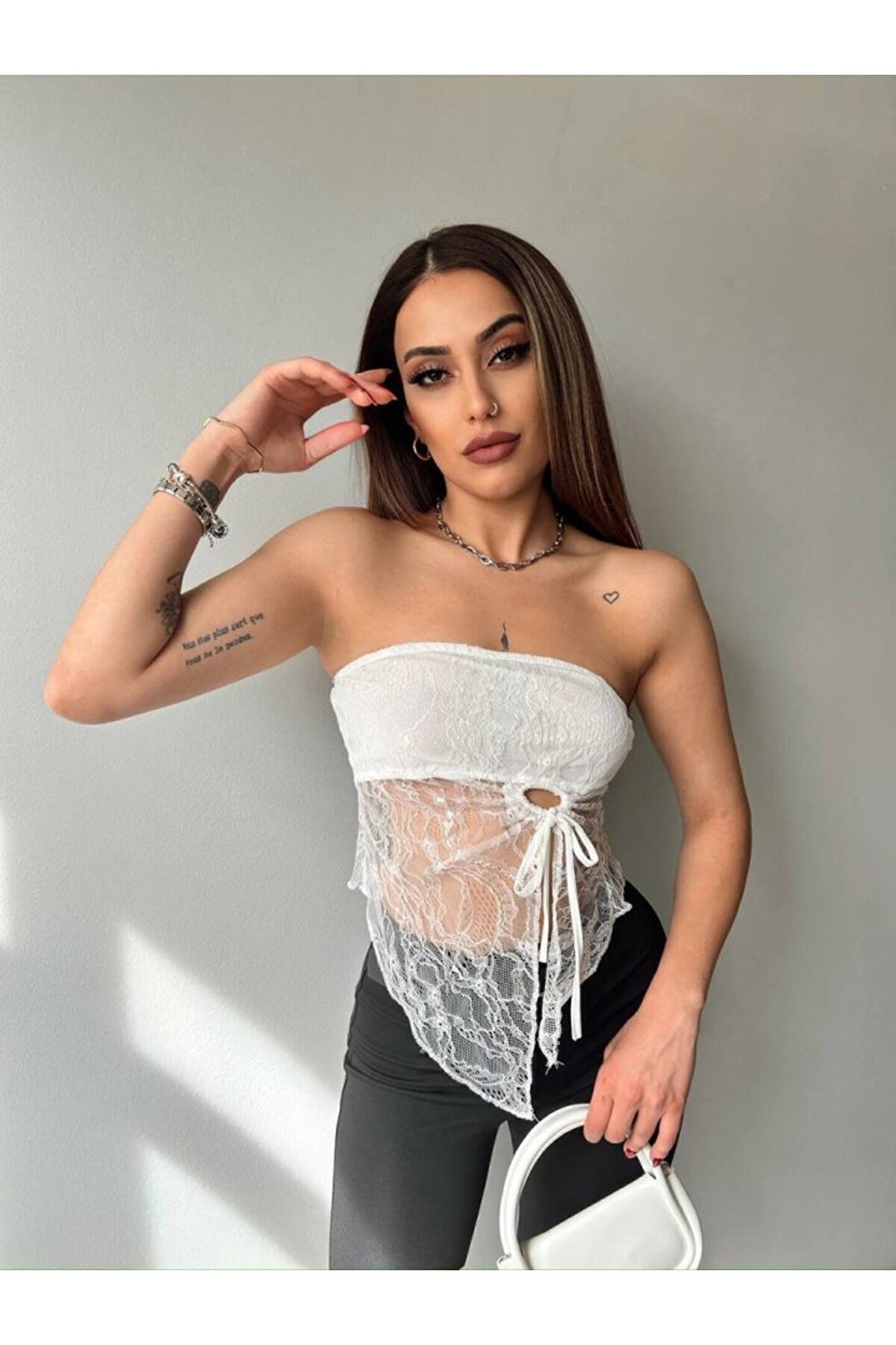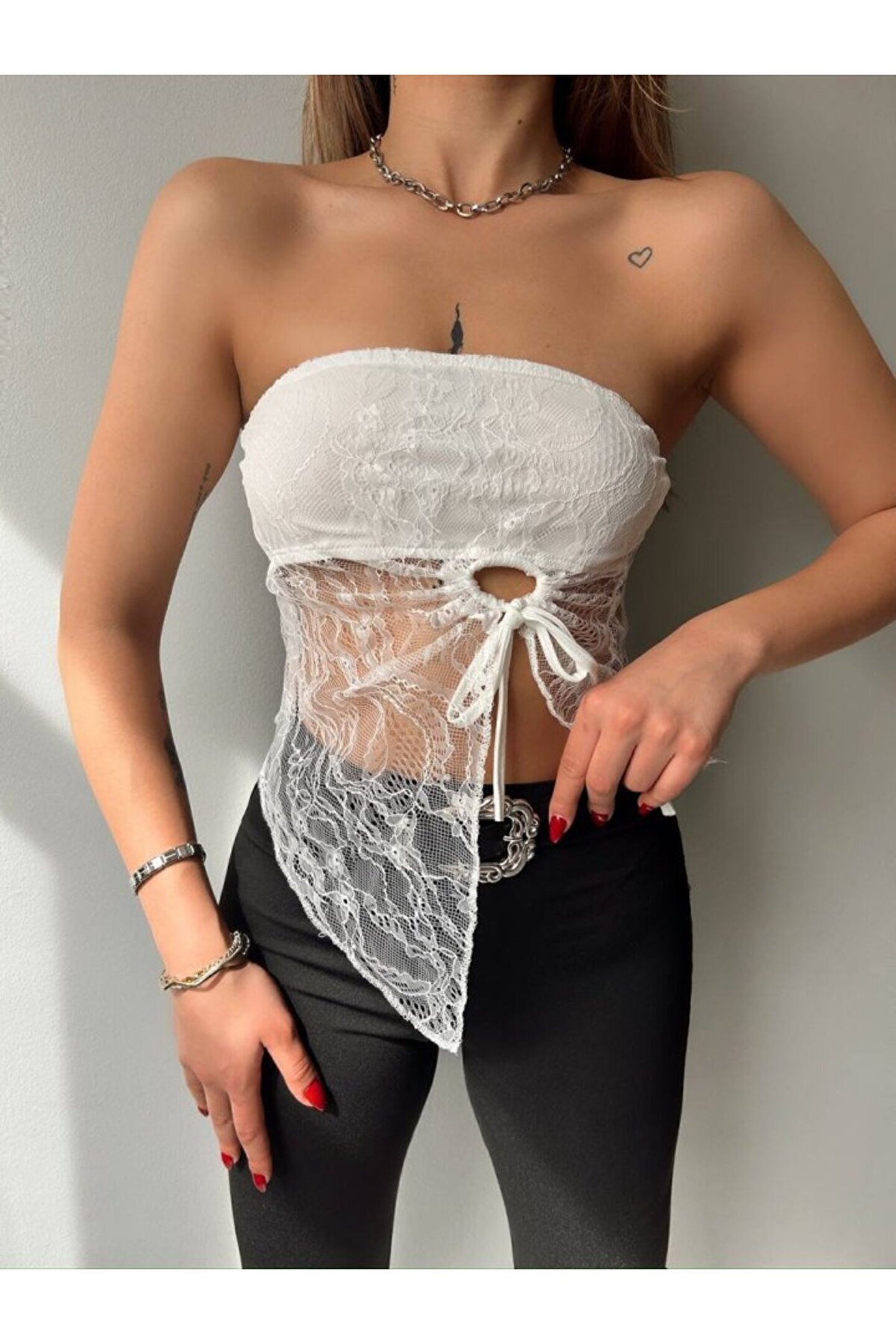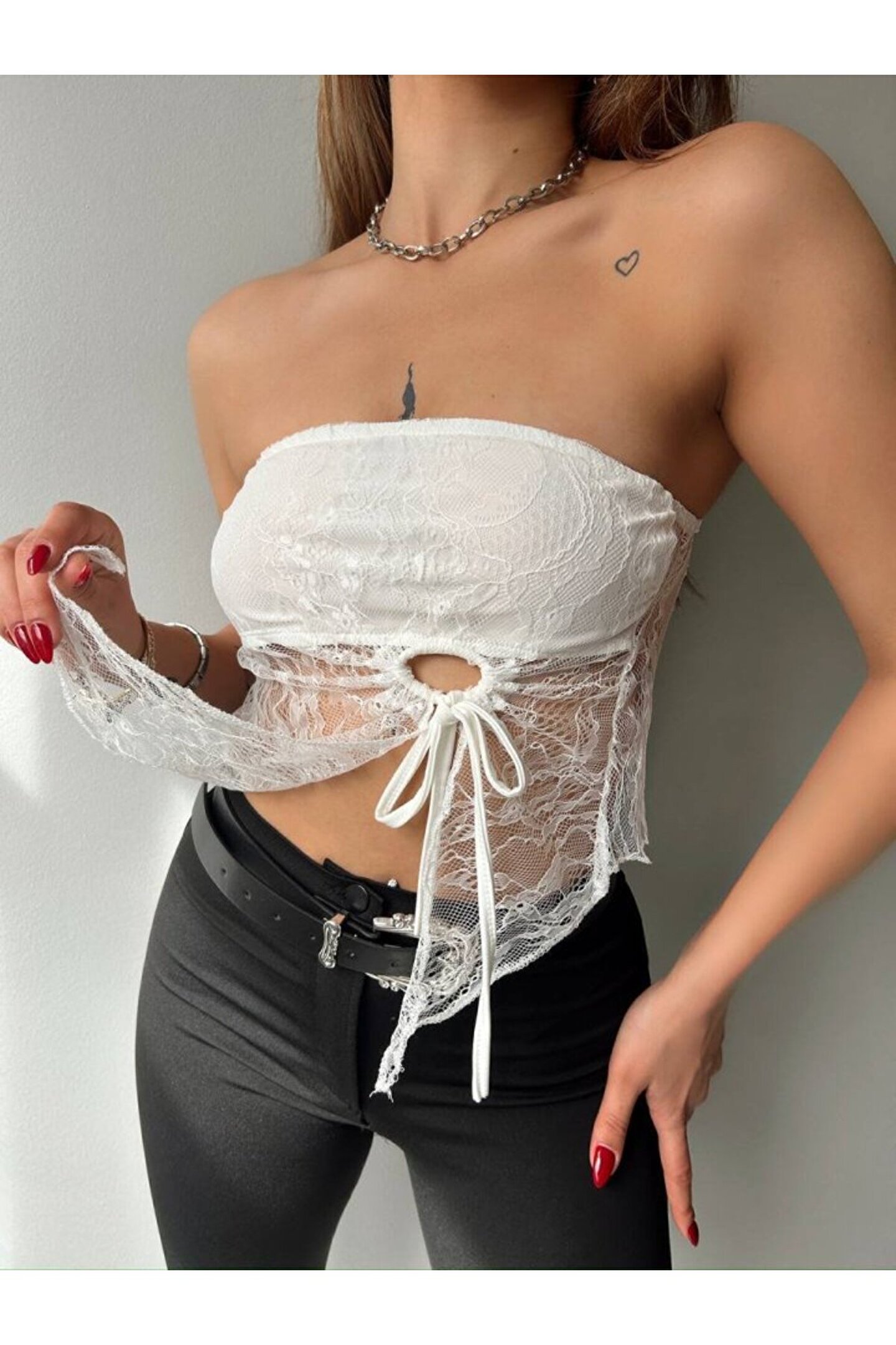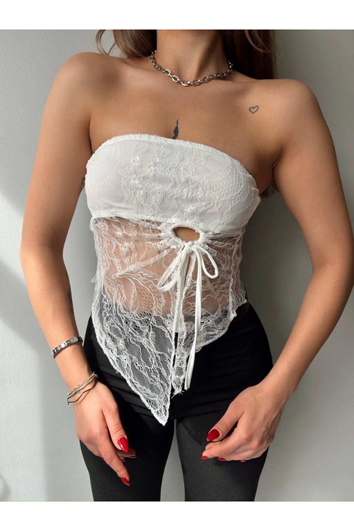 NOSTALJİX Myterrax Kadın Göğüs Ve Sırt Dekolteli Transparan Dantel Detay Bluz