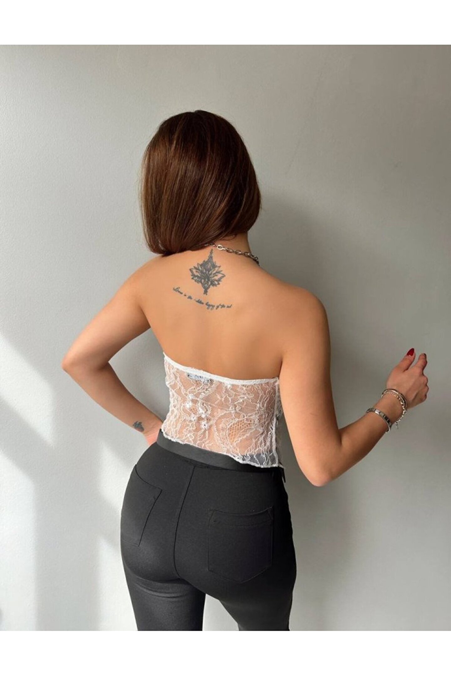 Kadın Göğüs Ve Sırt Dekolteli Transparan Dantel Detay Bluz