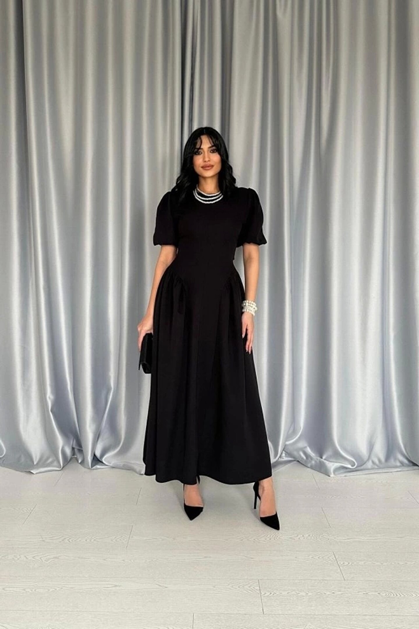 Siyah Etek Yanları Büzgülü Balon Kollu Elbise