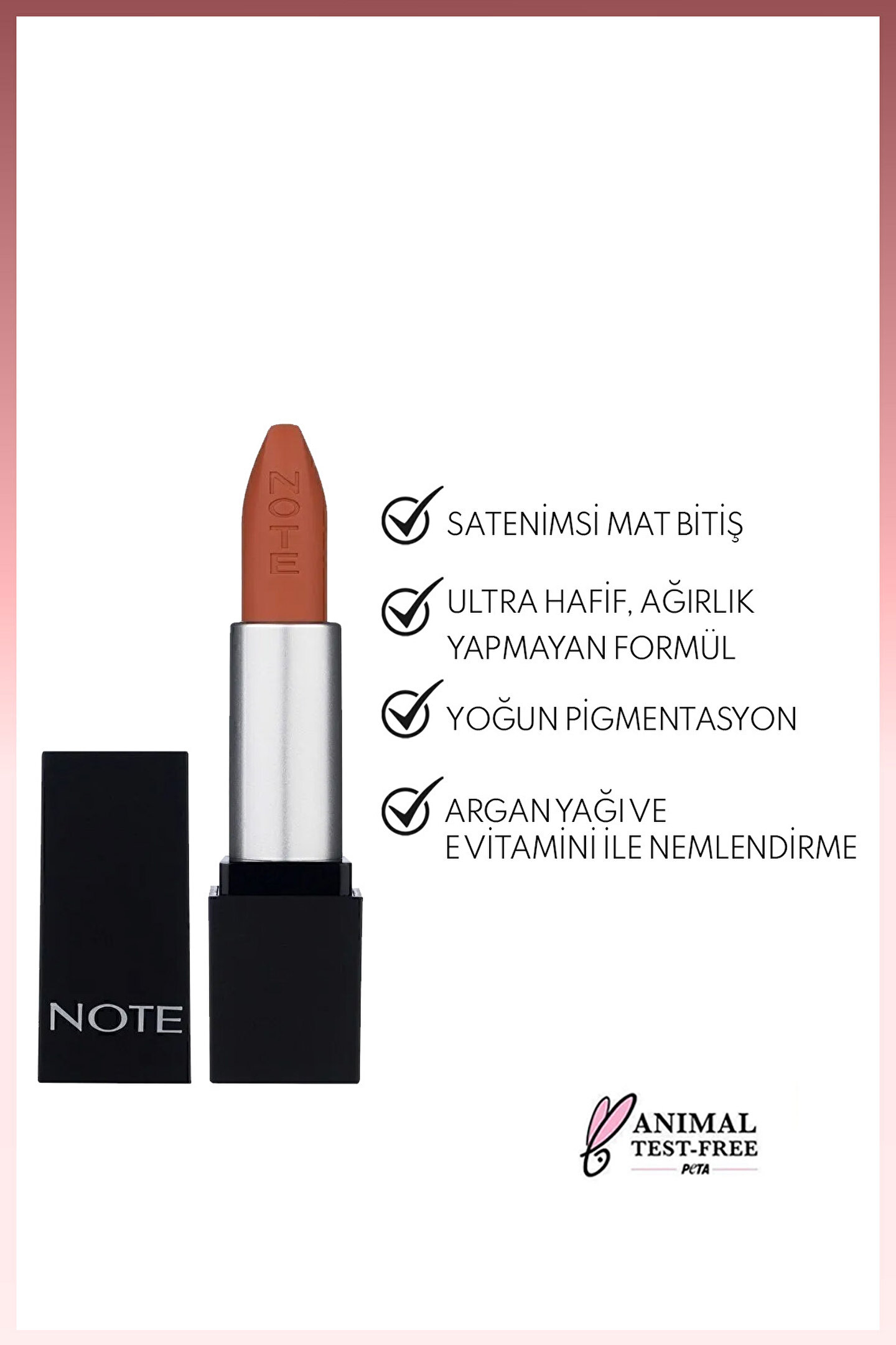 Tek sürüşte kusursuz mat görünüm sağlar.; Uzun süre kalıcıdır ve bulaşma yapmaz.; İçeriğindeki Argan Yağı ve E Vitamini ile dudaklarınızı nemlendirir ve pürüzsüz görünüm sağlar.; En güncel ürün bilgileri için lütfen satın aldığınız ürünün ambalajını kontrol ediniz.