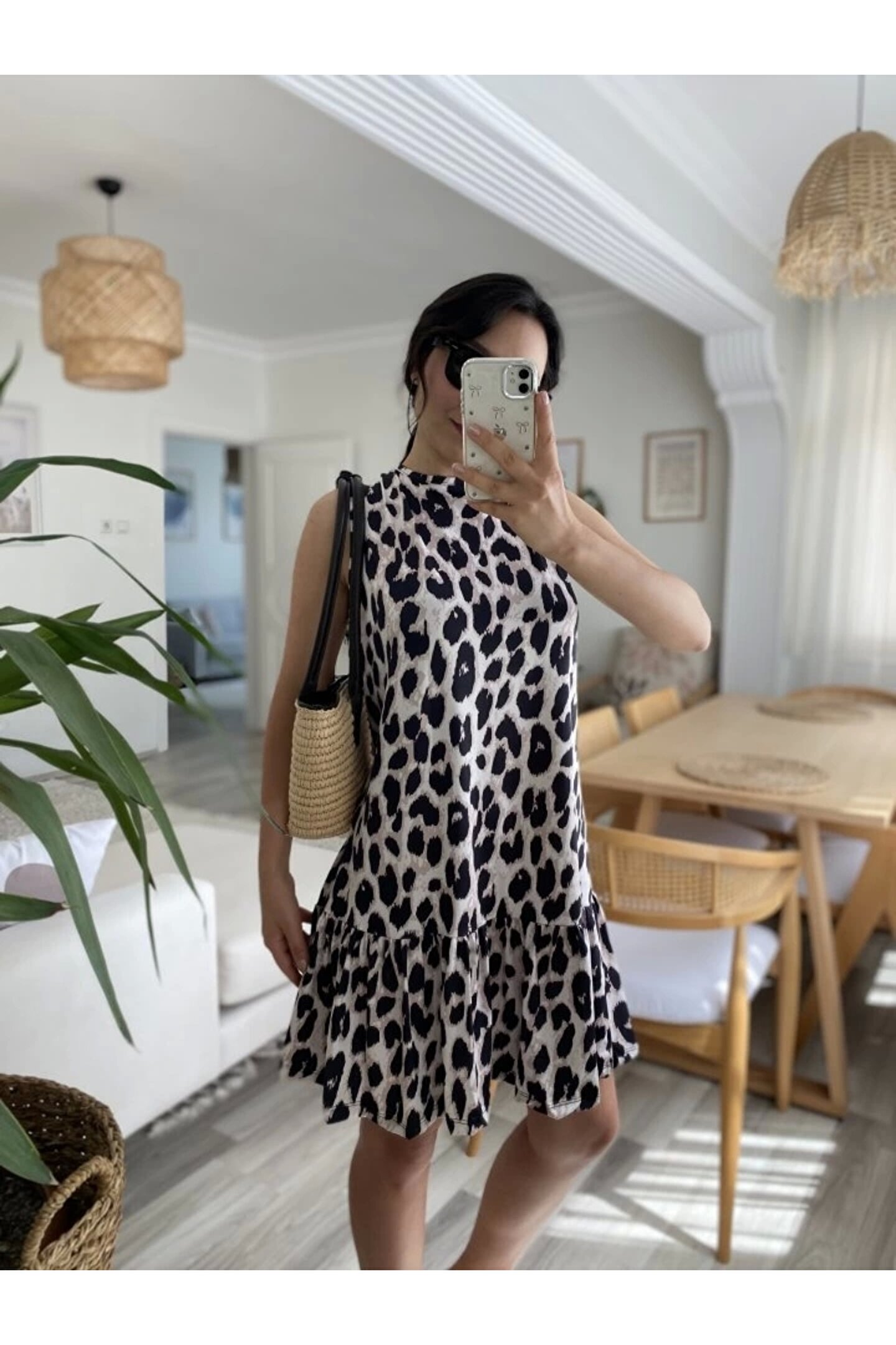Nova Bazaar Kadın Kolsuz Sırttan Bağlamalı Fırfırlı Leopar Desenli Süprem Elbise