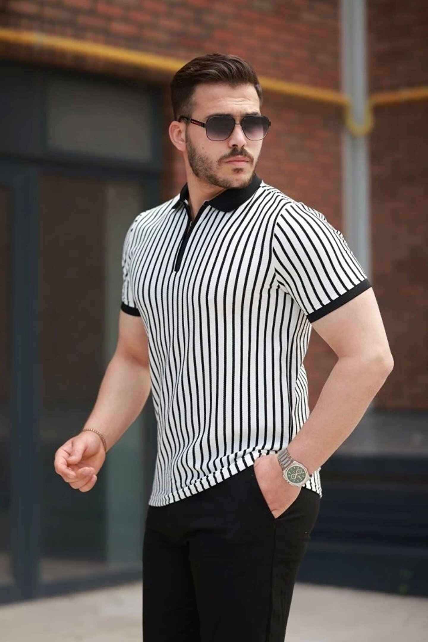 novafems Erkek Çizgili Fermuar Yakalı Kısa Kollu Tişört