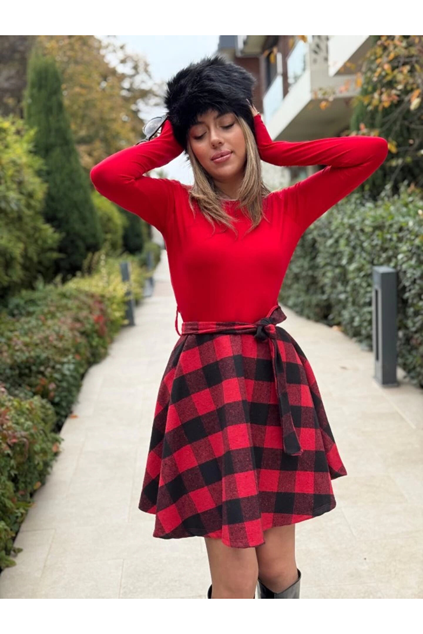 novafems Kadın Uzun Kollu Bisiklet Yaka üst Viskon Alt Ekose Kısa Elbise