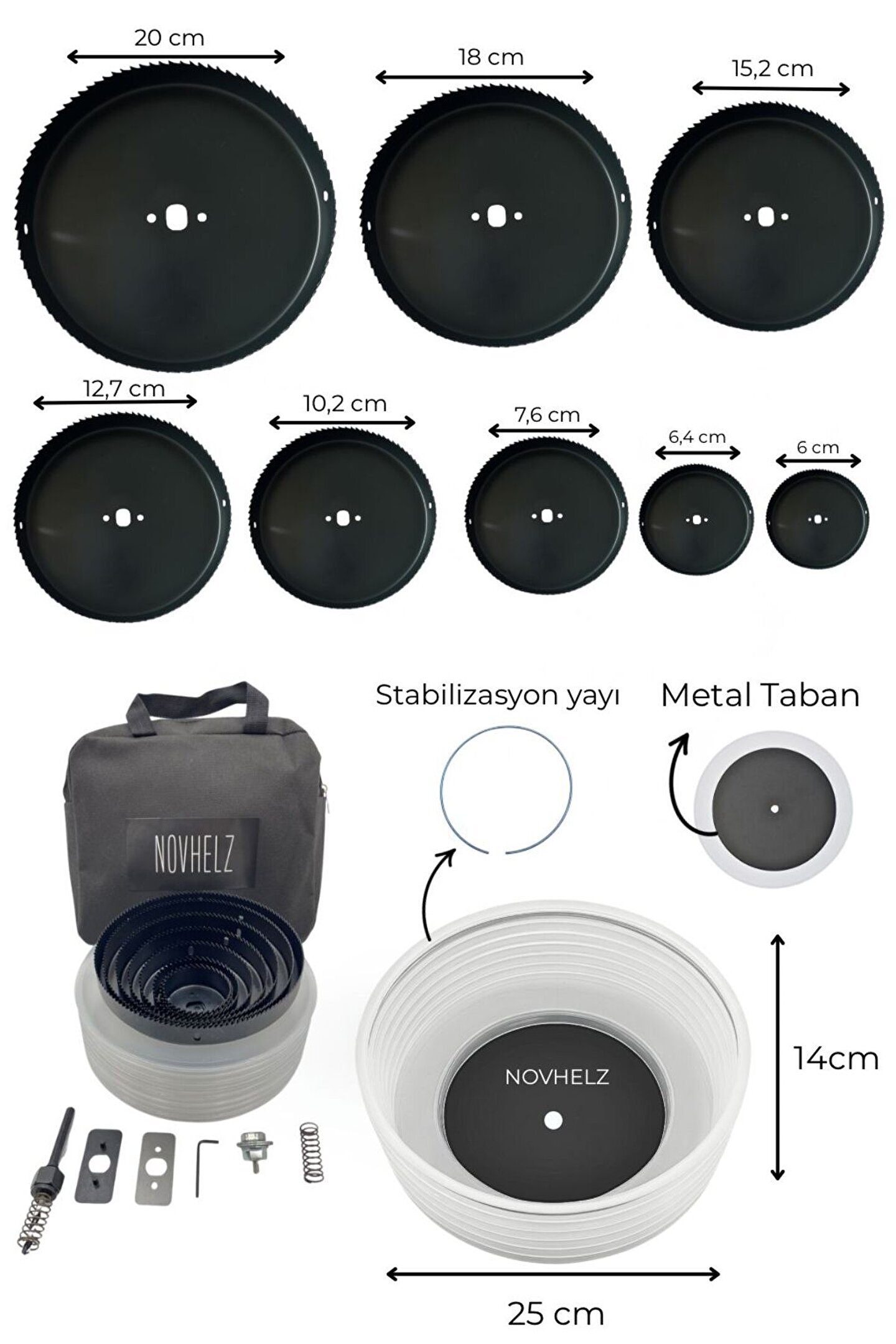 Nov-27 ; KUMAŞ ÇANTA İLE GELMEKTEDİR.; Toz Tutucu: Ø 240mm Panç Çapları: Ø 60 / 64 / 76 / 102 / 127 / 152 / 180 / 200 mm Novhelz panç setimiz çift panç özelligi ile 3 Watt'tan 18 Wata kadar sıva altı hareket sensörüden alçıpan kasası pançına kadar bir elektrikçinin ihtiyaç duydugu tüm özellikleri içermektedir.; Yüksek kaliteli malzemeden üretilmiş olup, dayanıklılığı ve uzun ömürlü kullanımı garanti eder.; Kolay temizlenebilir yapısı ile hijyenik bir çalışma ortamı sunar.