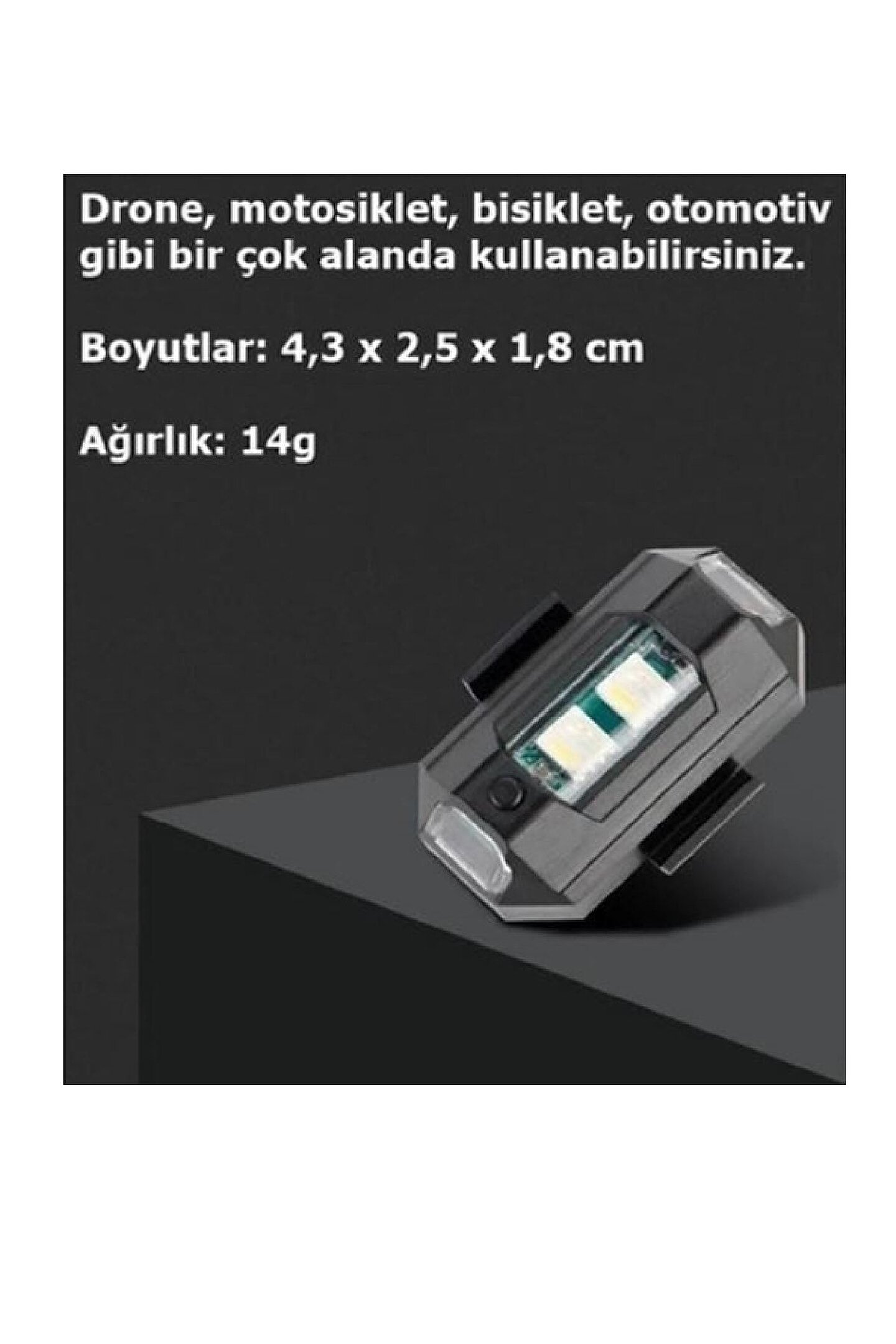 Motosiklet Drone Bisiklet Otomotiv Çakar Şarjlı Kablosuz Mini Led Lamba- 7 Farklı Renk 7 farklı renk ve çakar,20'den fazla mod kombinasyonu Aydınlatma modu: hızlı yanıp sönme, yavaş yanıp sönme ve sürekli aydınlatma Kablosuz kullanım: Şarj esnasında mavi bir LED ile gösterilir. ; Bittiğinde söner. ; Boyutlar: 4,3 x 2,5 x 1,8 cm Ağırlık: 14g Drone, motosiklet, bisiklet, otomotiv gibi bir çok alanda kullanabilirsiniz. ; RGB Motosiklet Drone Bisiklet Otomotiv Çakar Şarjlı Kablosuz Mini Led Lamba zorlu aydınlatma ve hava koşullarında ve hava karardıktan sonra uçuşlar sırasında güvenliği ve görünürlüğü artırmak için tasarlanmış bir çakar lambadır. ; Cihaz, gün batımı ve karanlıktan sonra görünürlüğünüzü arttıracak şekilde tasarlanmıştır. ; Aydınlatma 5 km'ye kadar bir mesafeden görülebilir. ; Dahili 110 mAh bataryaya sahiptir. ; Kullanım ömrü oldukça uzundur. ; Şarj olma süresi yaklaşık 30 dakikadır.;