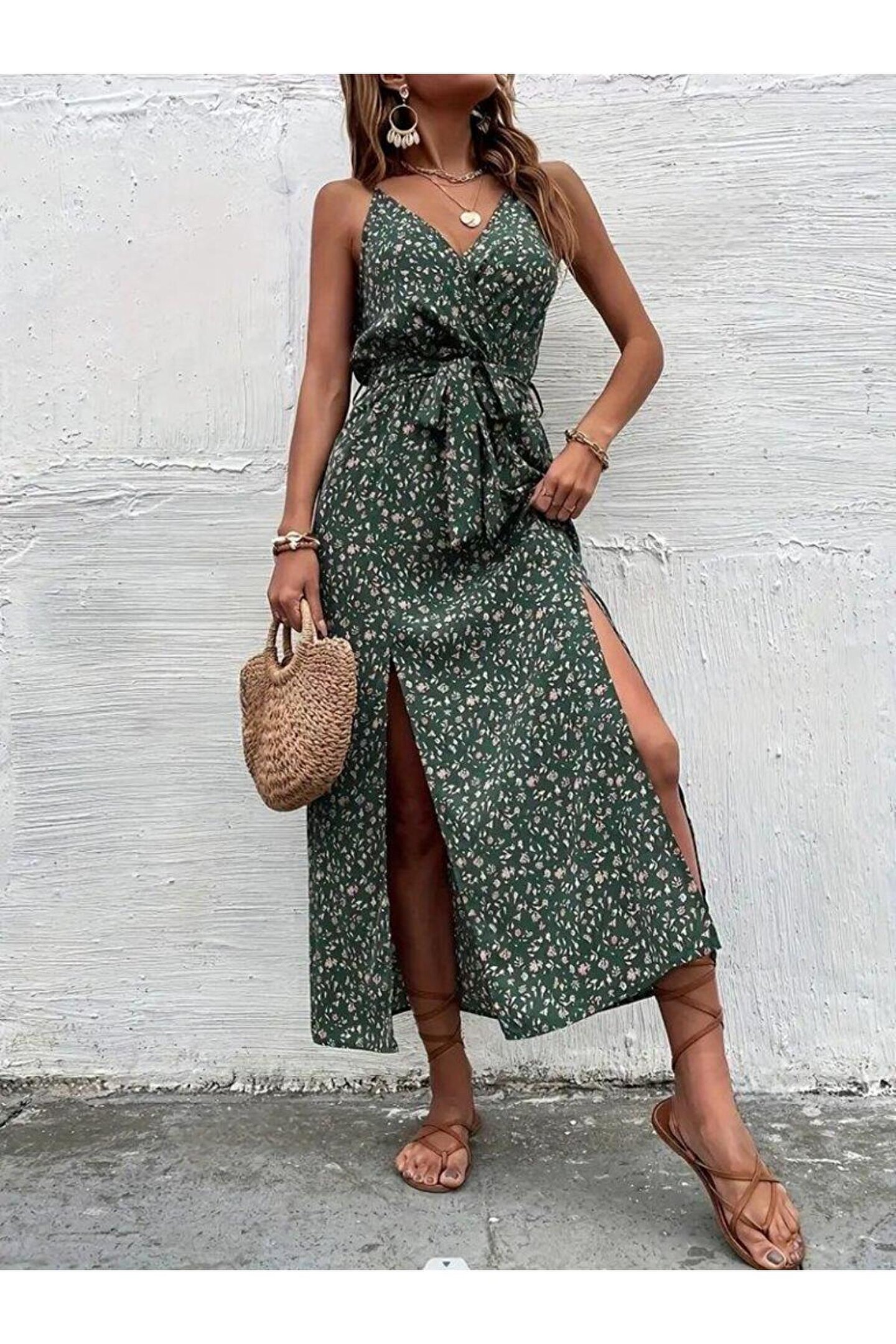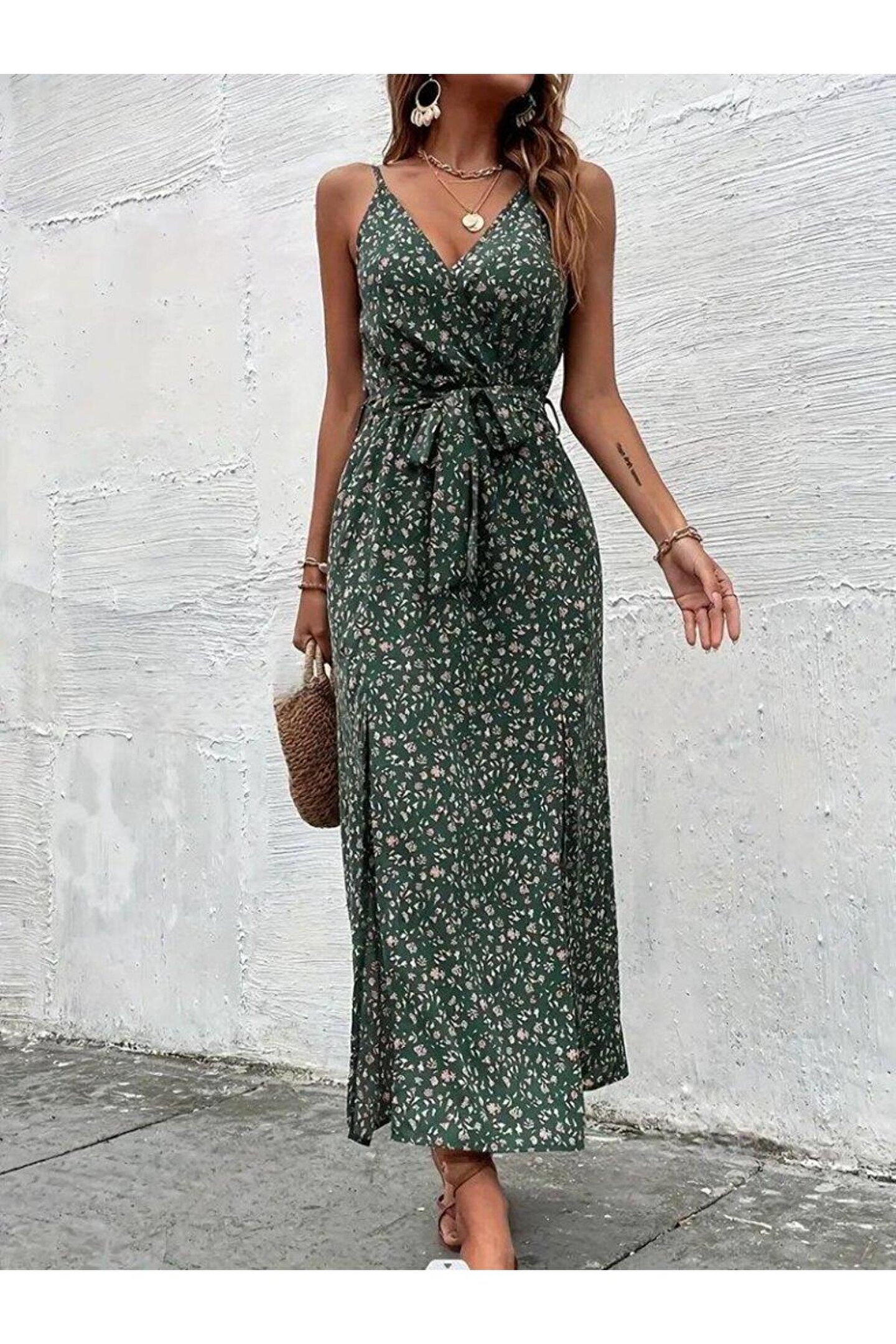 Omarı Kadın Ip Askılı Kruvaze Yakalı Yırtmaçlı Uzun Desenli Kuşaklı Süprem Elbise
