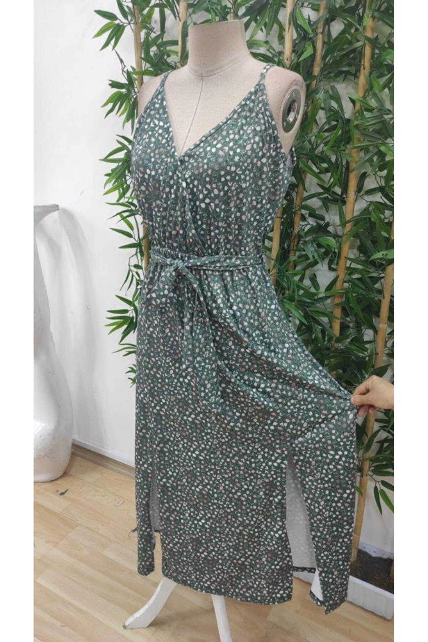 Kadın Ip Askılı Kruvaze Yakalı Yırtmaçlı Uzun Desenli Kuşaklı Süprem Elbise