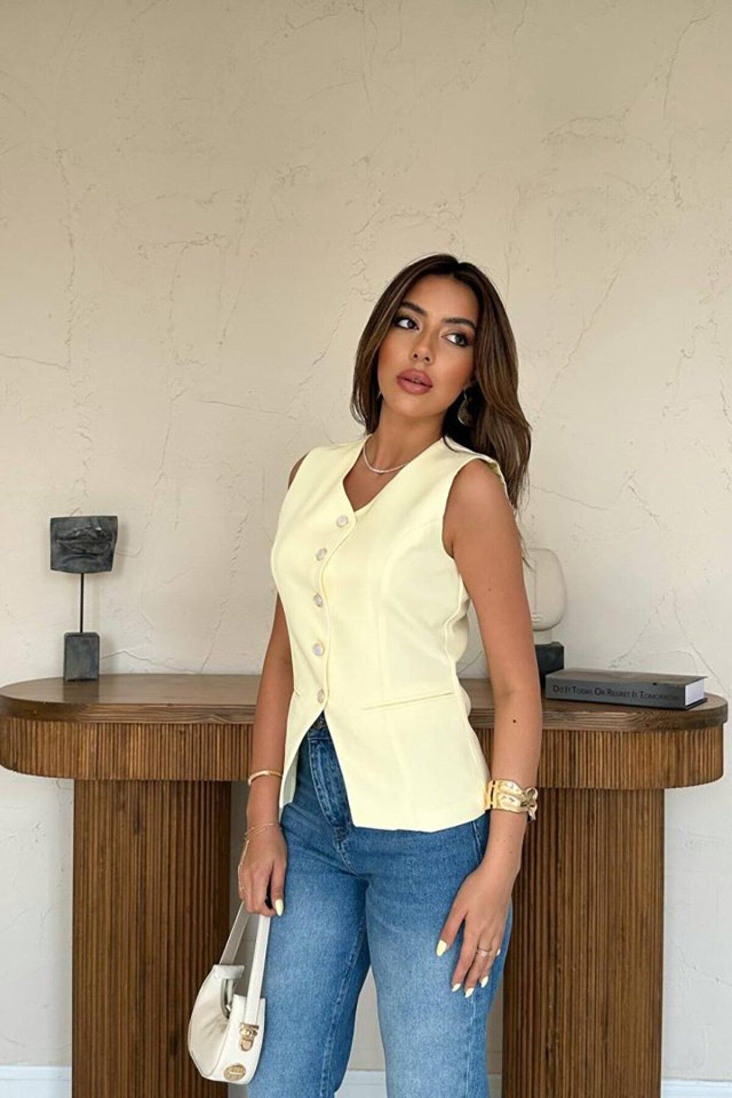Sarı Belden Oturtma Detaylı Düğmeli Yelek